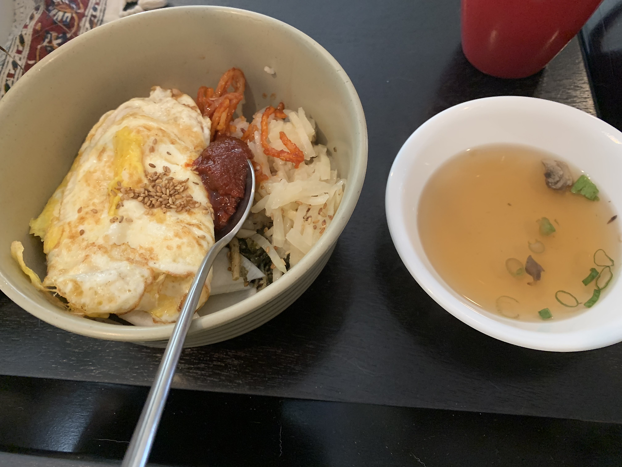 아침으로 치즈 케이크를 먹었는데 사진 찍는 걸 깜빡했다. 집 가는 비행기 타기 전에 본가에서의 마지막 식사. 비빔밥은 자취생이 하기 어려운 메뉴인데 본가에서는 그냥 반찬 꺼내서 고추장 넣고 비비면 된다는 게 너무 좋다. 계란 프라이는 2개.