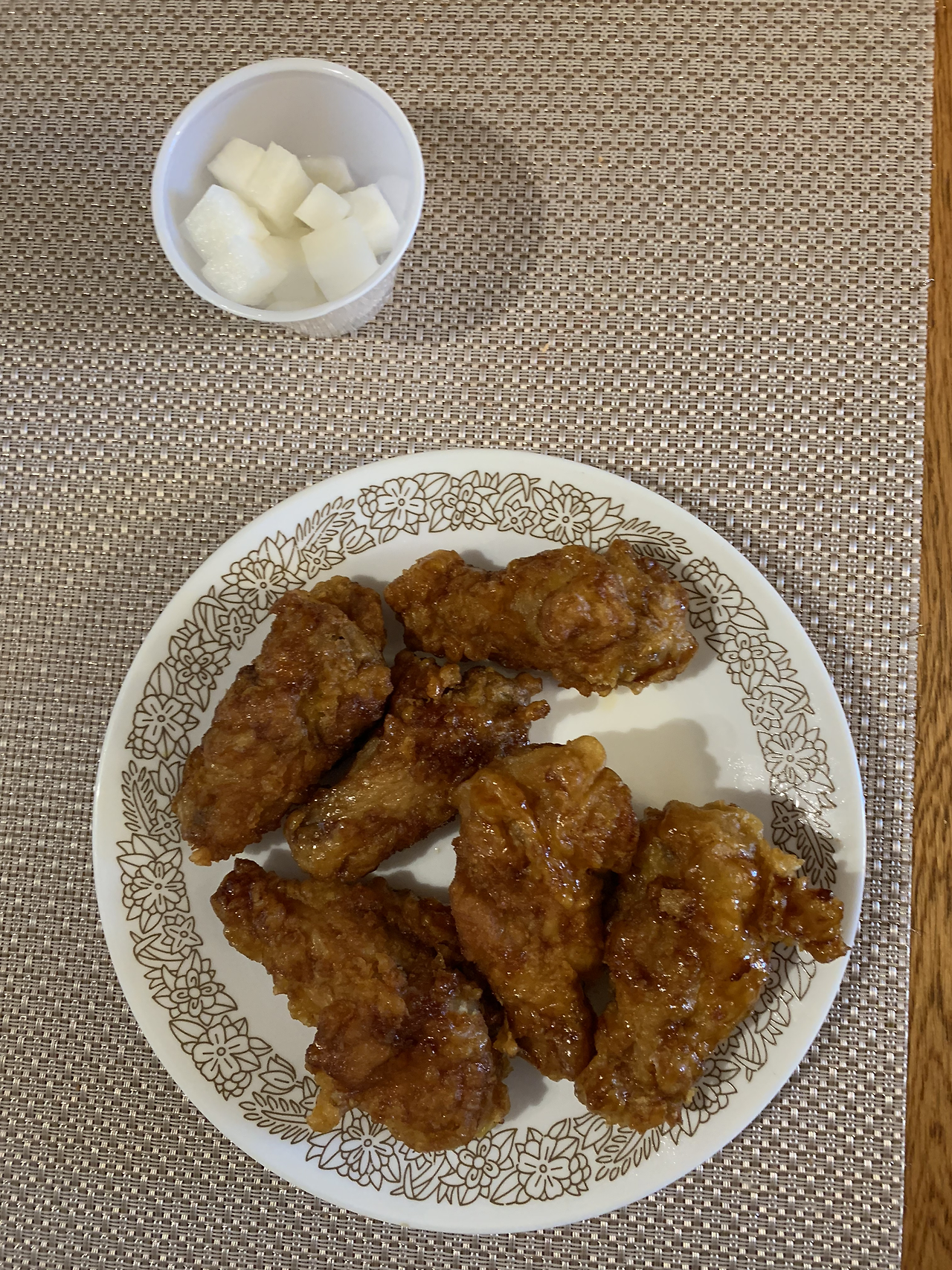건강하게 아침 먹고 바로 안 건강한 간식. 점심도 안 건강한 치킨. 에어프라이어에 돌리기 귀찮아서 전자레인지에 돌렸는데도 바삭하고 맛있다.
