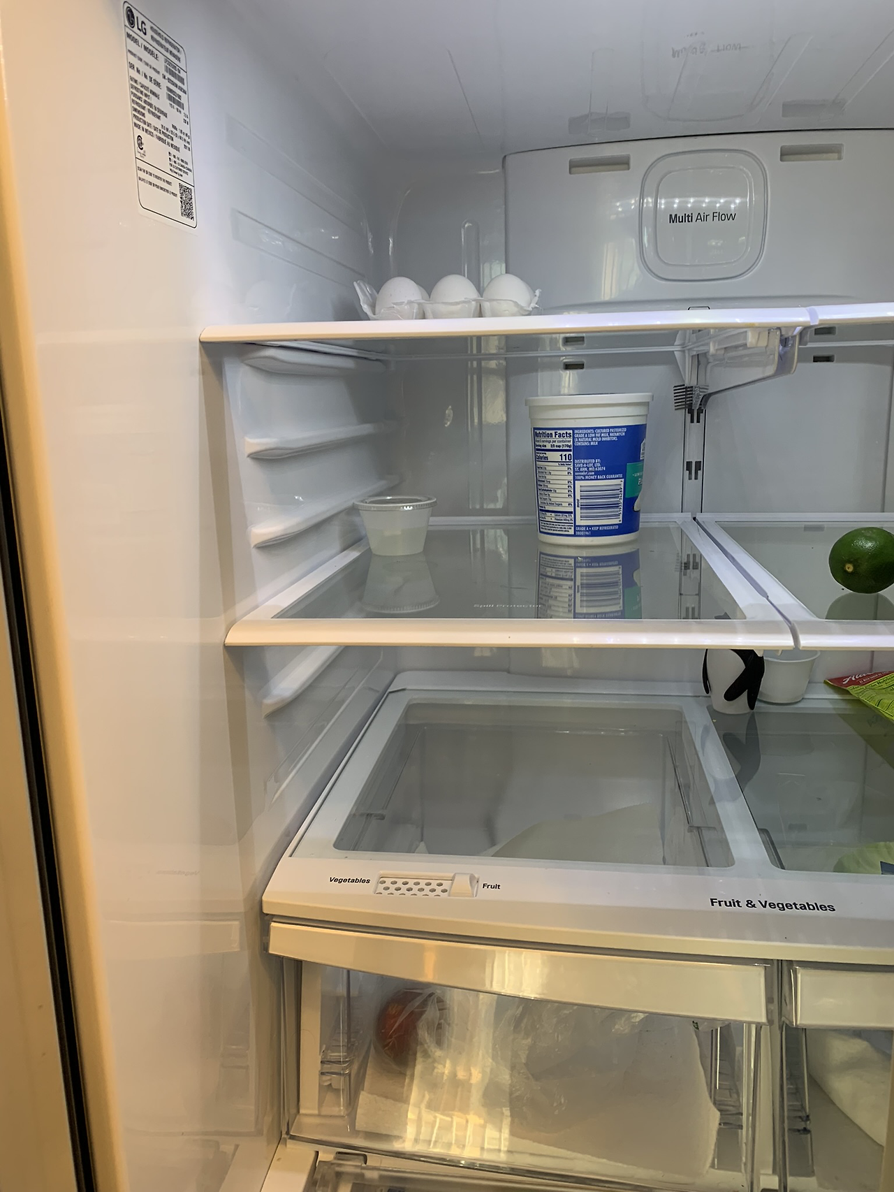 재미로 찍어본 오늘 장보기 전 냉장고 상황,, 물론 냉동실은 꽉 차 있다. 너무 휑 해서 웃겨서 기념으로 찍었다. 아침으로 뷰리토! 옆에 빨간 무언가는 스리라 챠. 매운 거 못 먹지만 좋아한다. 그래서 시판 떡볶이는 다 매워하면서도 좋아한다.
