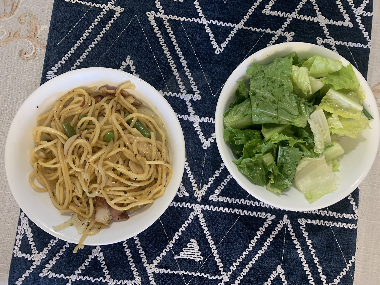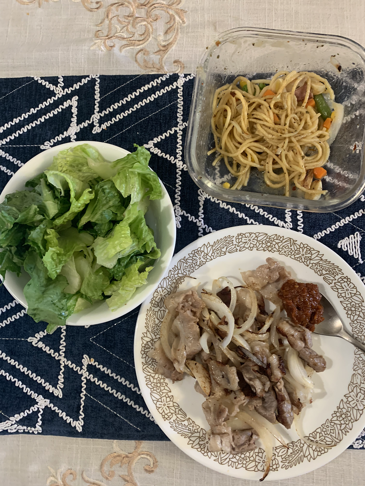 간식으로 쿠키. 점심으로 어제 만든 알리오 올리오에 야채. 저녁에도 파스타 남은 거 먹으려고 했는데 양이 애매하게 남아서 냉동실에 있던 차돌박이도 구웠다.