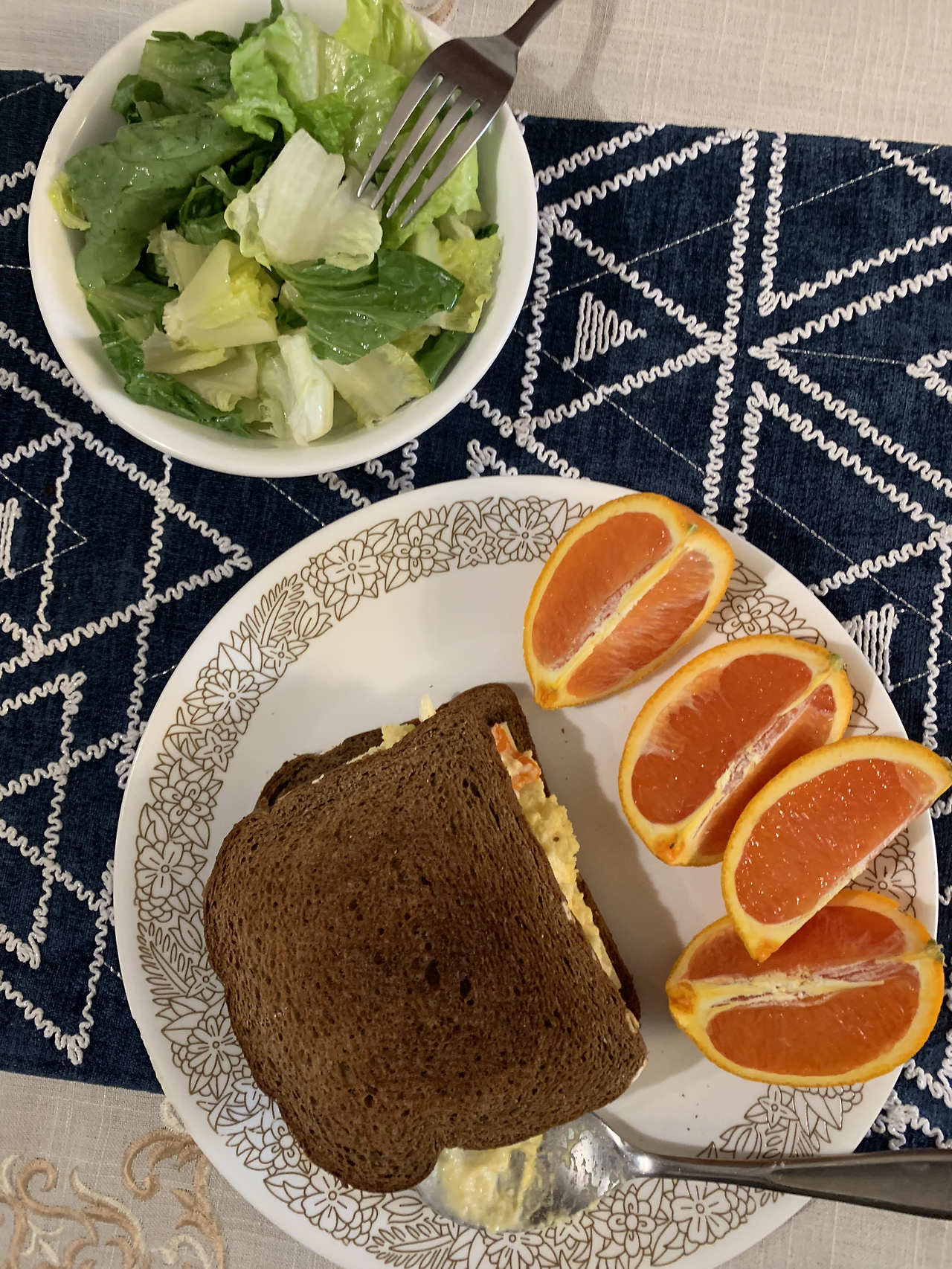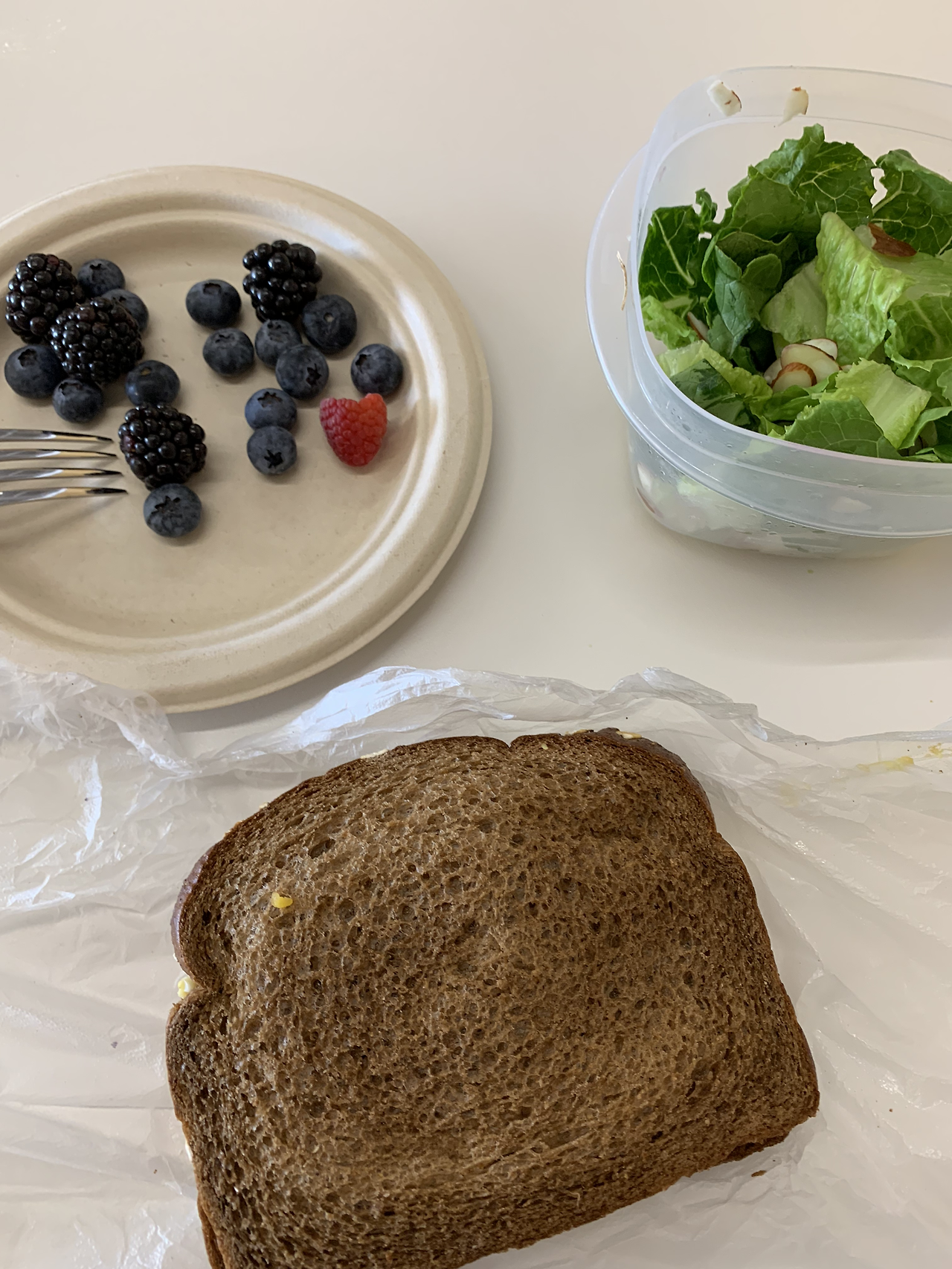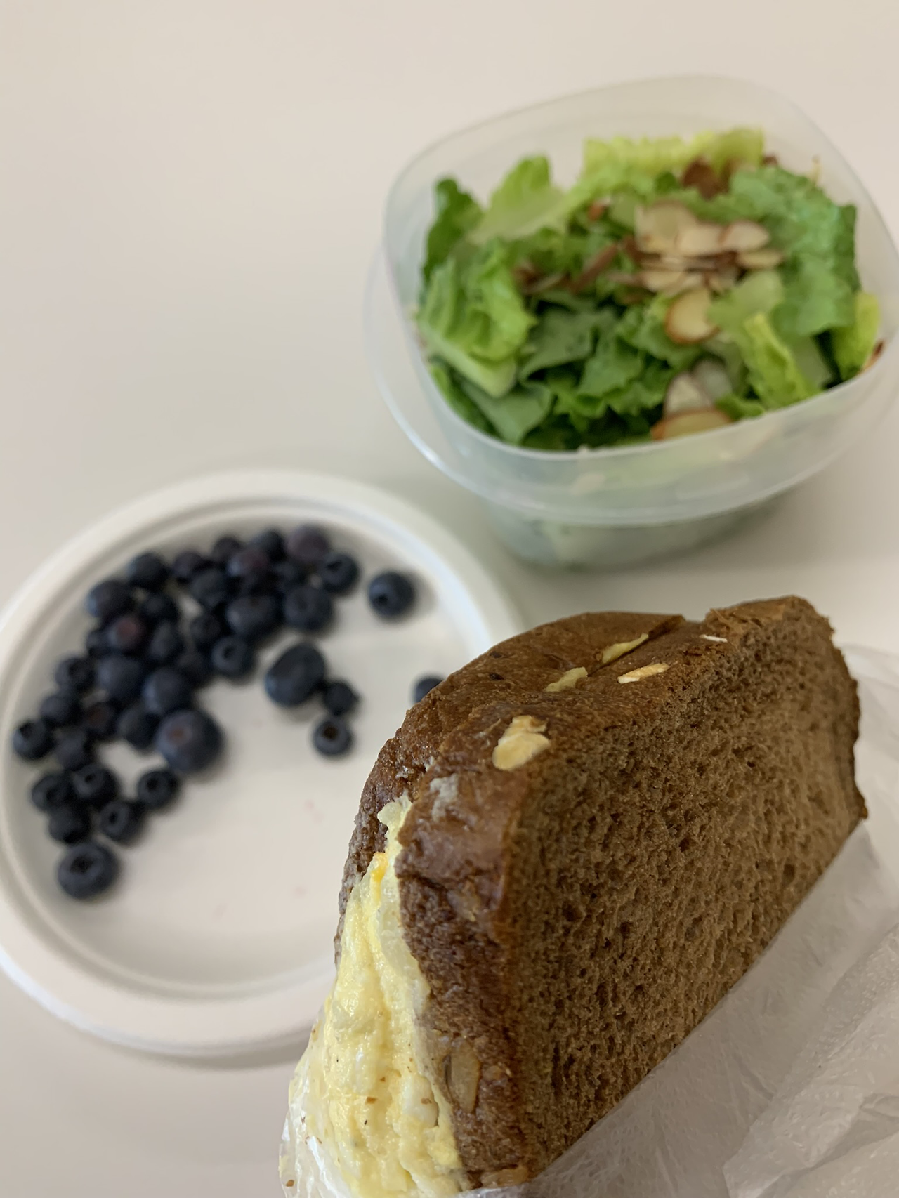출근해서 아침. 프로틴 바와 회사에 있던 프룻 스낵. 점심은 에그 감자 마요 일명 에감마 샌드위치와 샐러드를 싸 가지고 왔다. 블루베리는 회사에 있어서 조금 가져왔다.