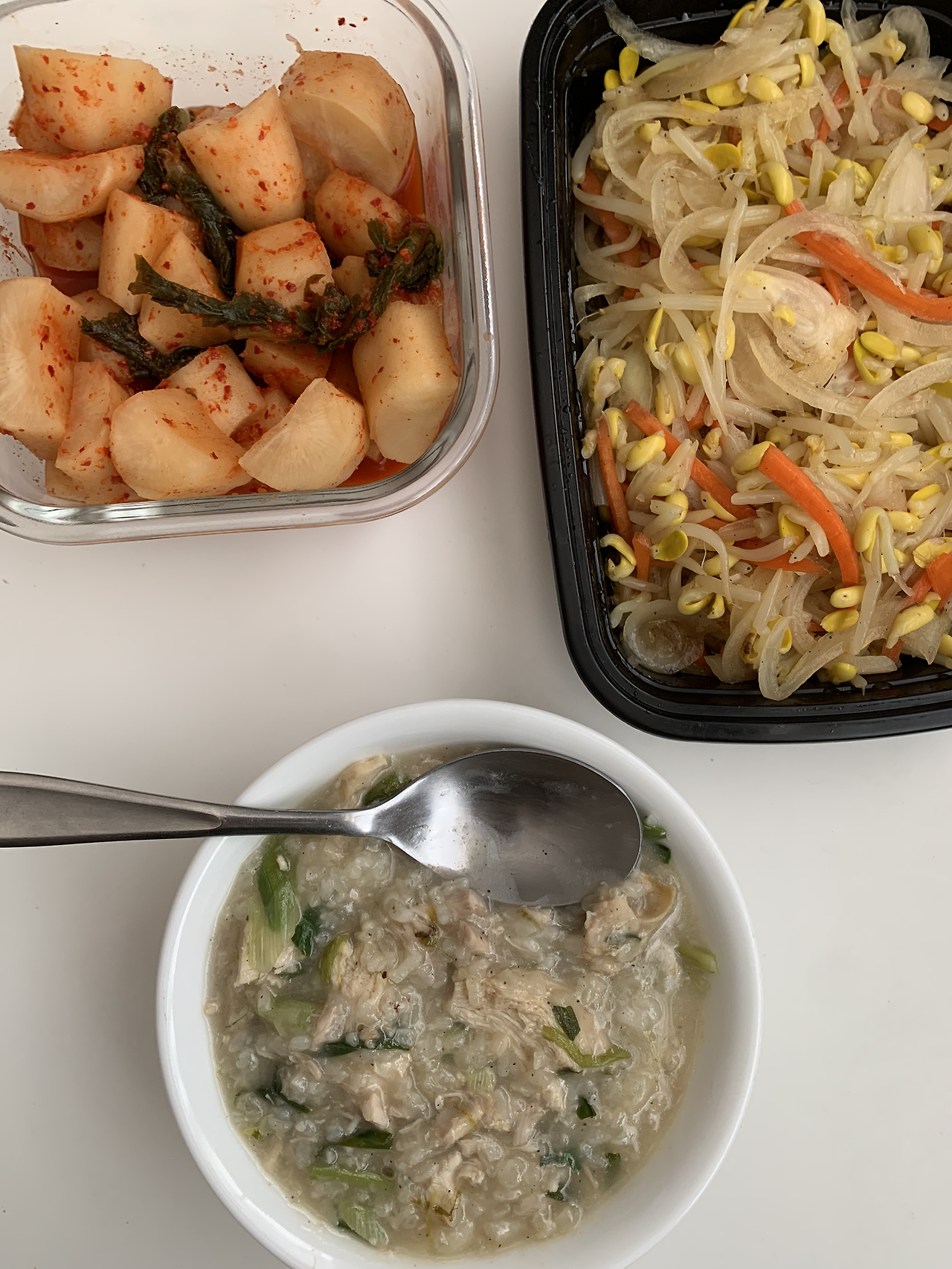 점심으로 닭죽과 반찬. 총각김치는 괜찮을 줄 알았는데 룸메가 냄새난다고 해서 후딱 먹어야 한다. 그래도 김치를 먹는 게 아주 가끔이라 아예 못 사게 하지는 않는다. 그냥 적당히 내가 알아서 눈치 보는 편.