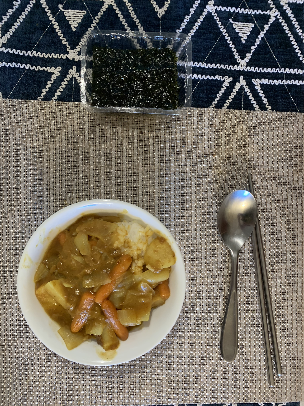 어제와 같은 아침! 오늘은 다진 양파도. 점심은 카레. 야채만 들어간 일본 카레다. 카레... 질려서 다시는 먹기 싫었는데... 그래도 카레 큐브를 처리해야 해서 만들었다.