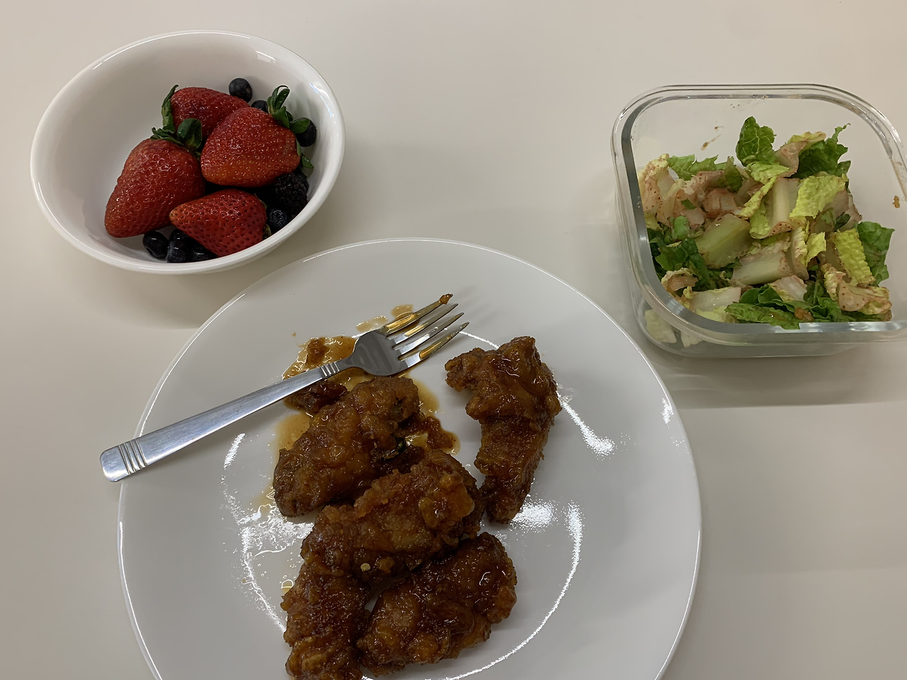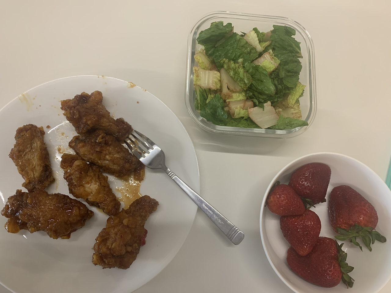출근해서 에너지바 아침,, 배고프다…. 점심은 싸온 치킨과 샐러드. 샐러드라기엔 그냥 로메인 레터스뿐이지만.. 상태도 영 별로다. 딸기는 회사 제공.