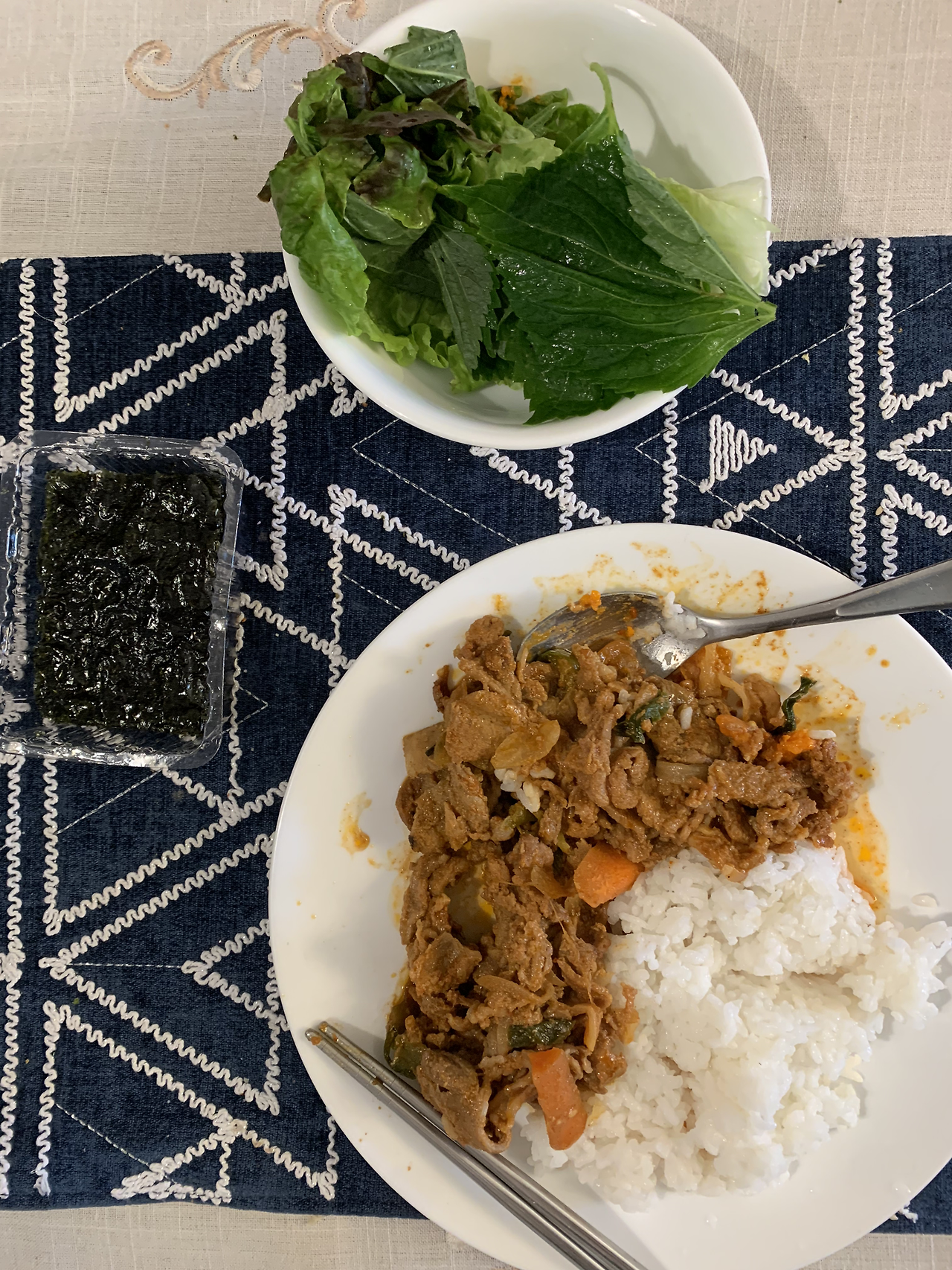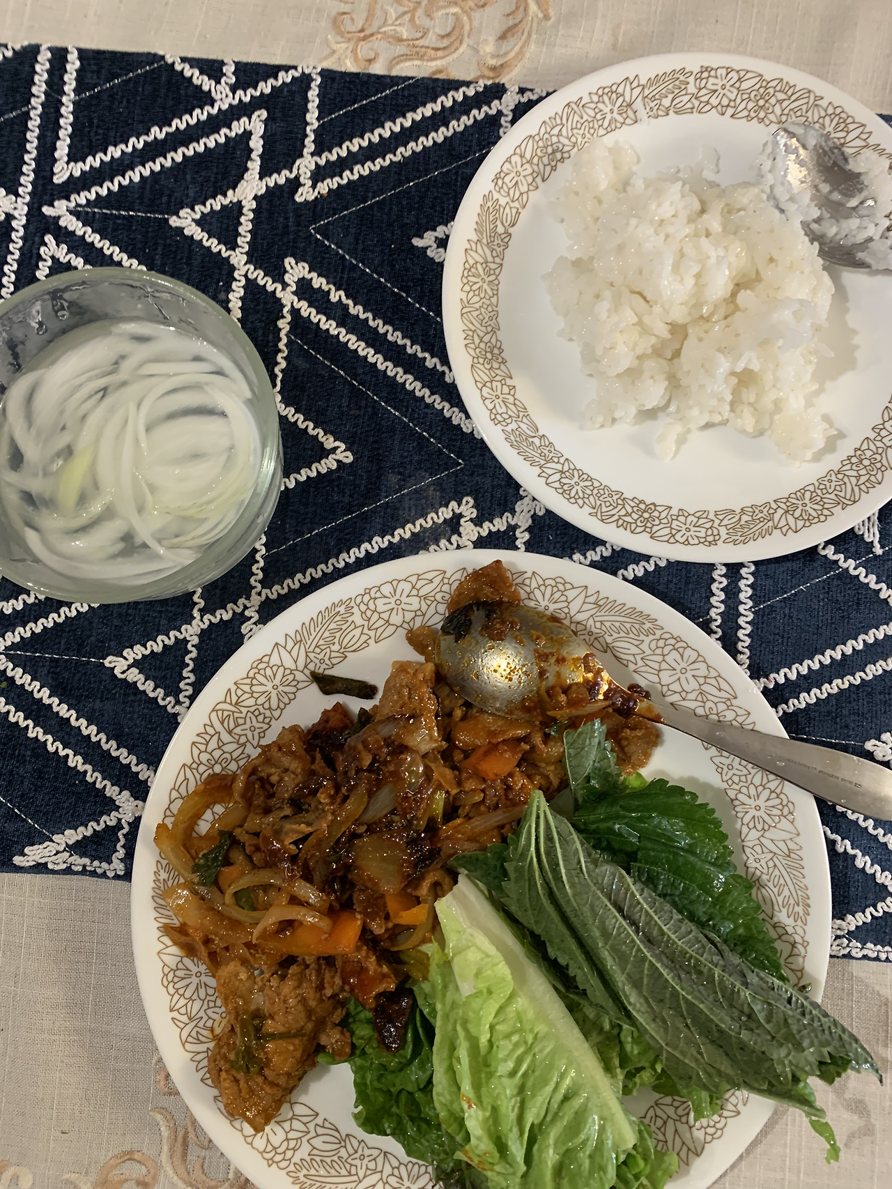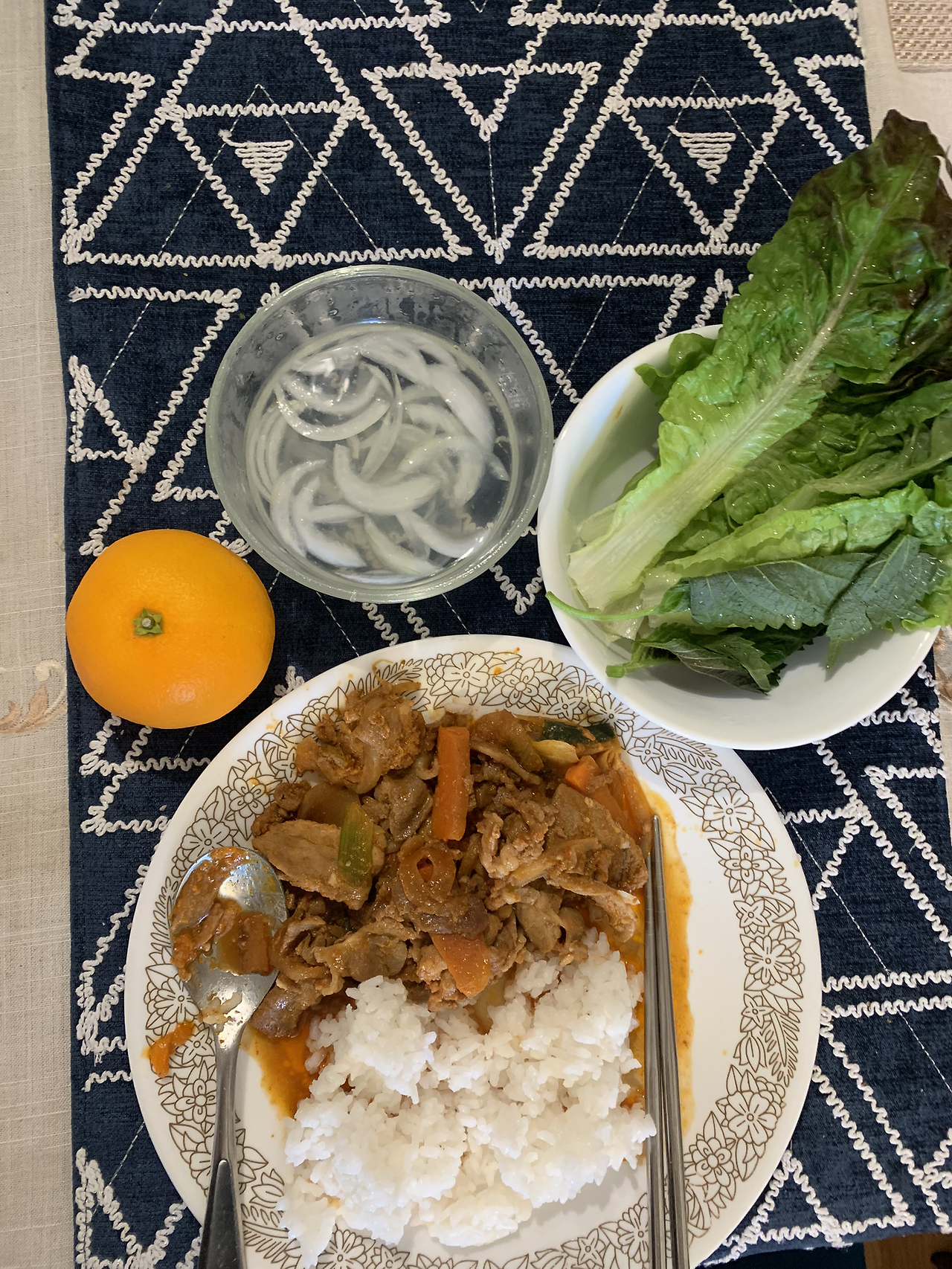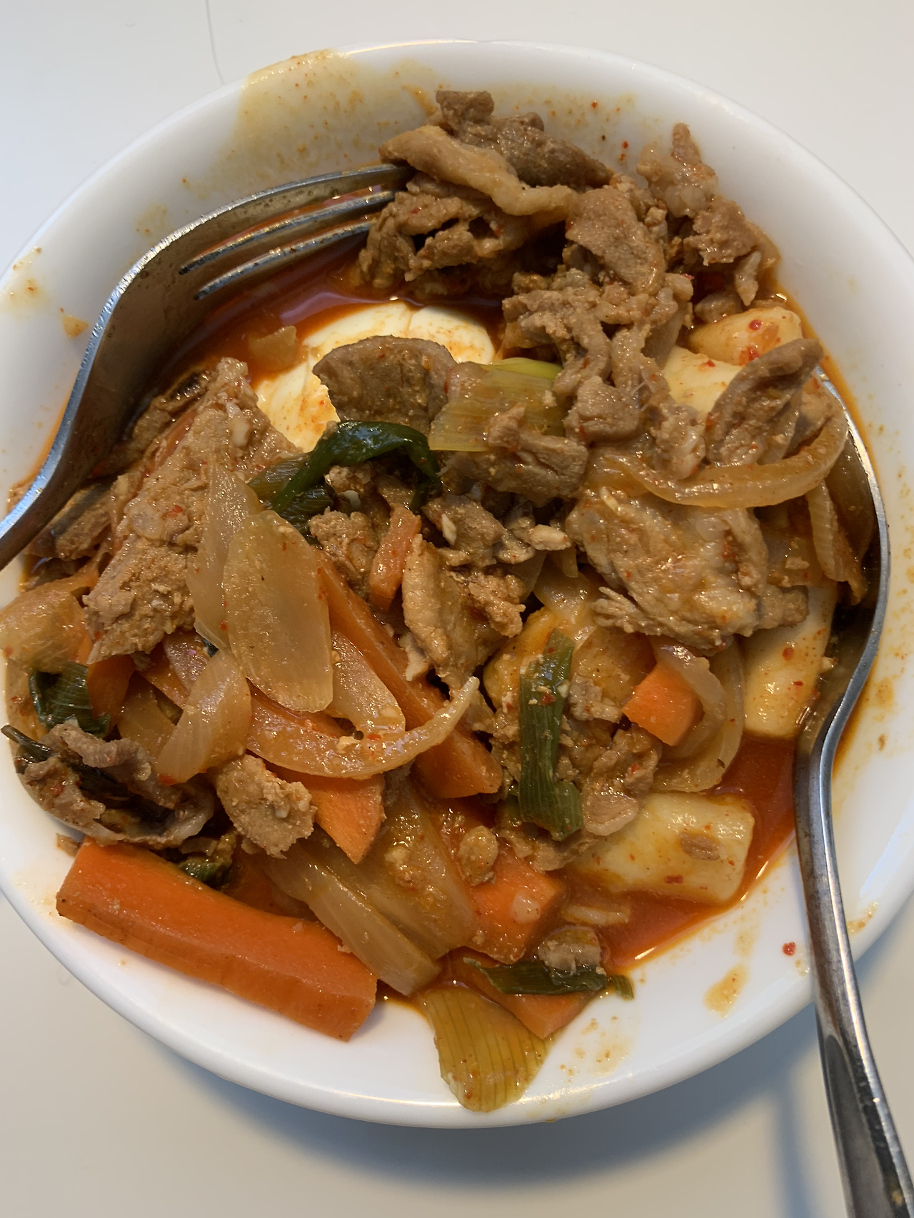 아침으로 뷰리토, 양파, 그리 칠리. 간식으로 포크 번. 점심으로 제육볶음에 떡볶이 떡 넣은 오묘한 맛의 냉털 요리... 본가에서 일주일을 보낼 거라 냉장고를 비워야 해서 대충 만들었다. 맛은 별로,,