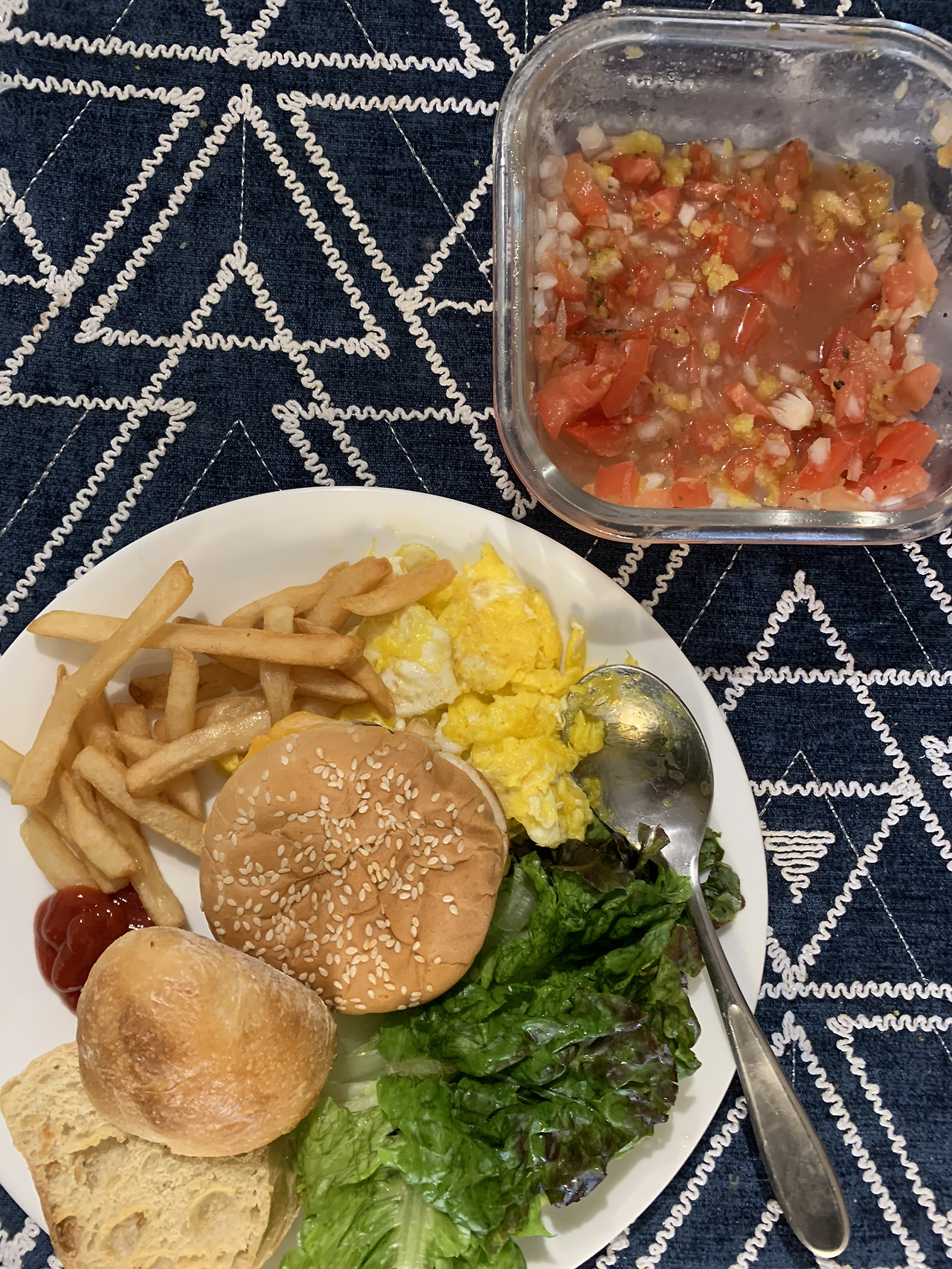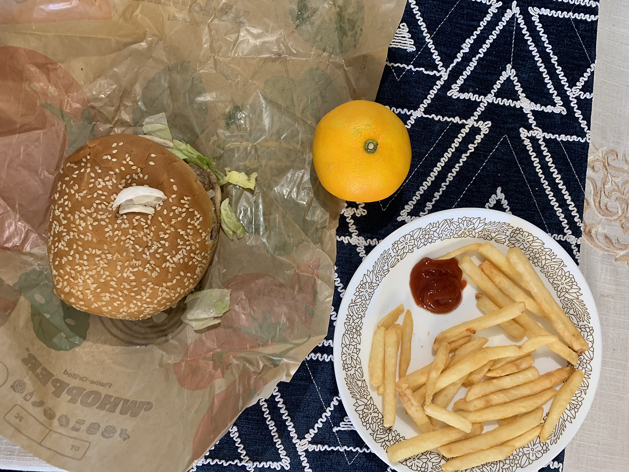 여하튼 아침으로 요거트와 냉동 블루베리. 간식으로는 포크 번. 저번에 먹고 맛있어서 한번 더 샀다. 점심은 버거킹. 버거킹 와퍼 3개 치즈 버거 3개 프라이 3개 해서 13달러 하는 쿠폰이 있어서 이번 주 점심은 전부 햄버거를 먹을 예정이다. 건강에는 안 좋겠지만,, 식비도 줄이고 무엇보다 요리에 흥미를 잃었다...