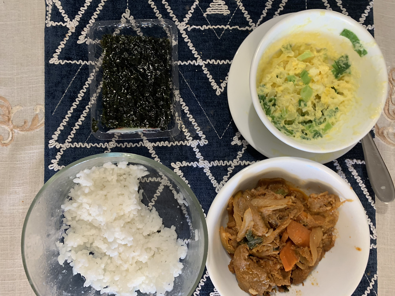 저녁은 제육볶음과 계란찜. 계란과 물 섞고 전자레인지에 돌리면 완성되는 초간단 계란찜이다.