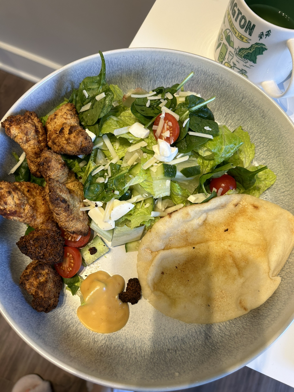 저녁은 치킨 텐더 샐러드와 갈릭 파우더 뿌린 난.