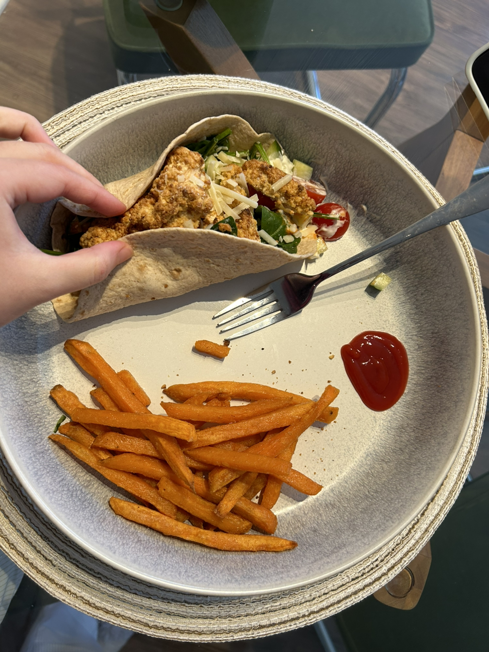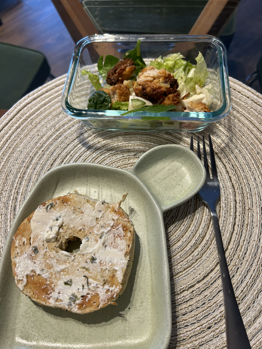아침은 항상 메뉴가 같아서 조금의 차이만 있다. 오늘은 브리 치즈 조금 추가. 점심은 치킨랩과 스윗 포테이토 프라이. 야채를 꽉꽉 눌러 담았으니까 나름 건강식 아닌가???