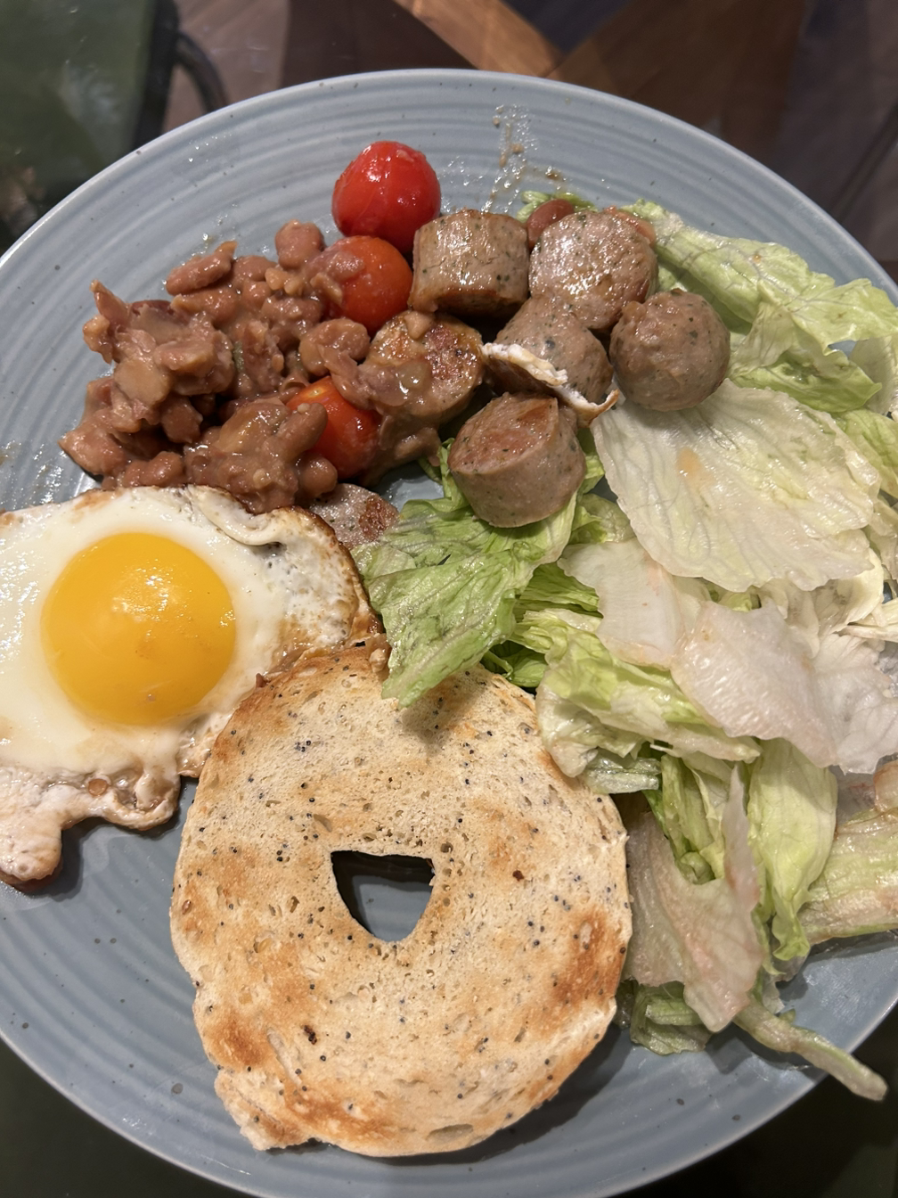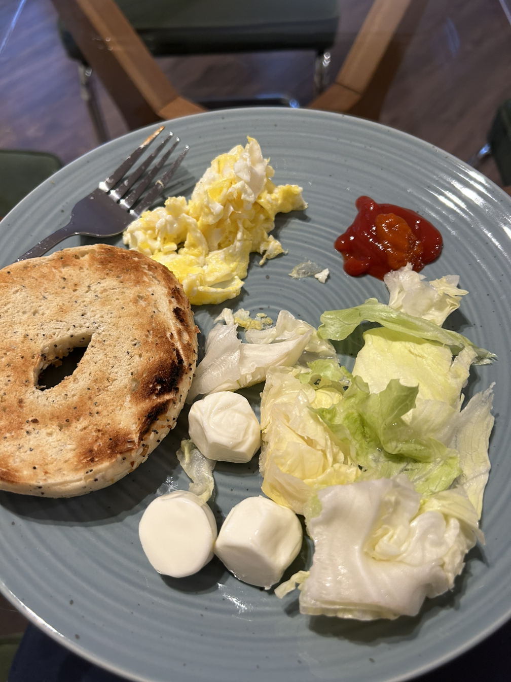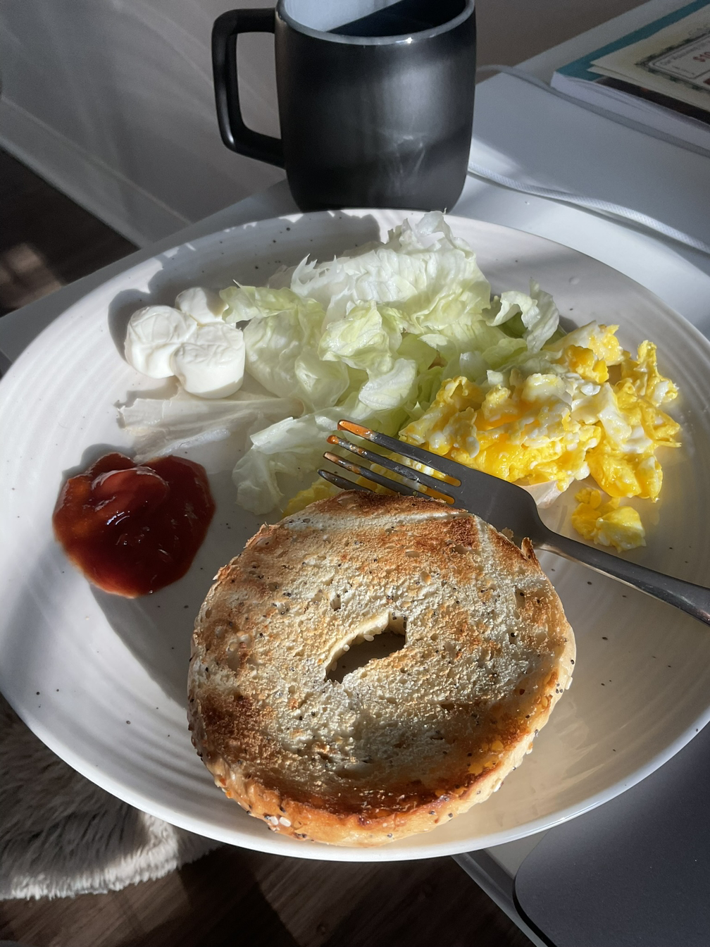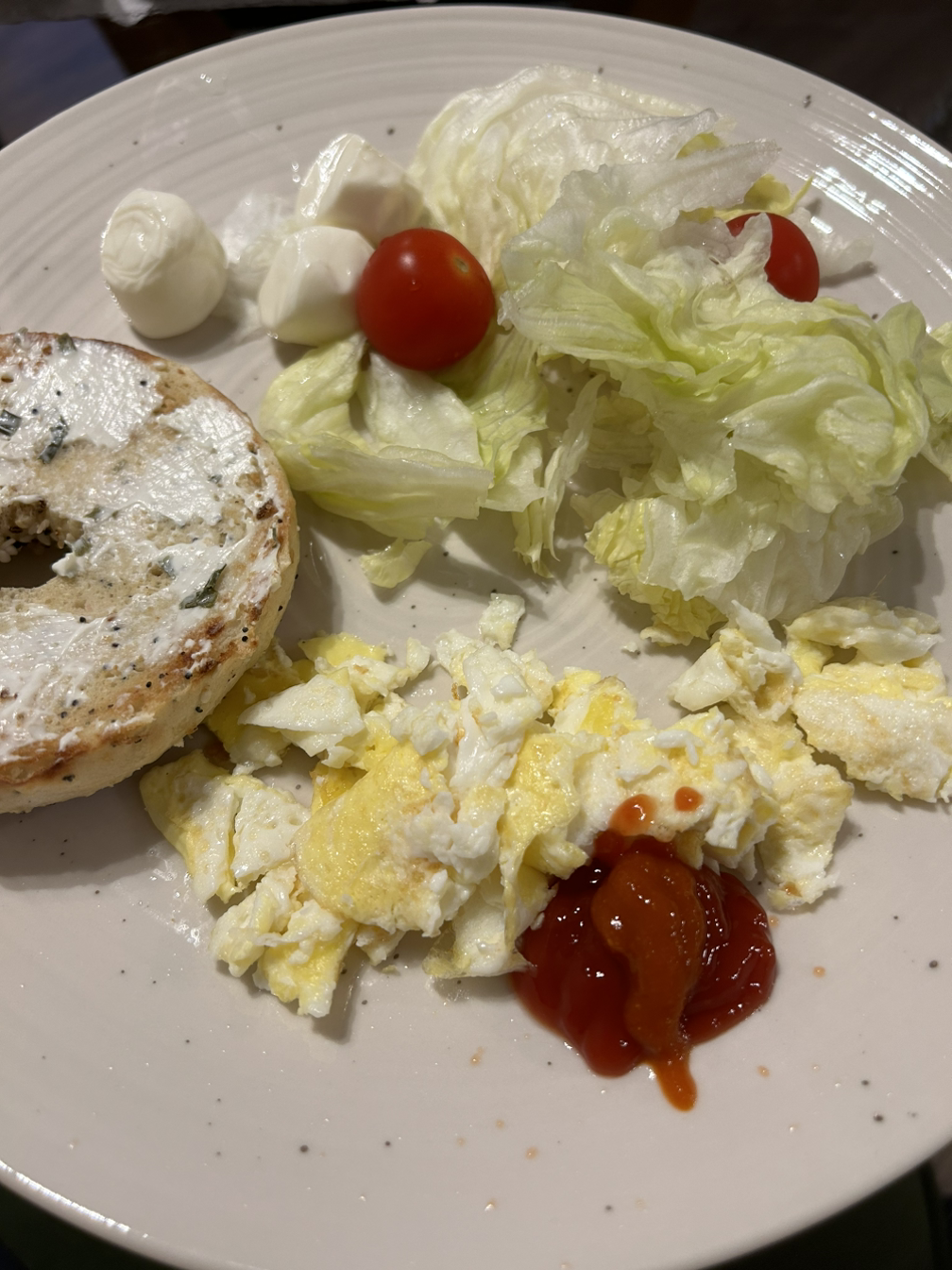 아침으로 베이글과 양상추 체리 토마토 모짜렐라 스크램블 에그와 케챱+스리라챠. 한동안 야채를 너무 안 먹은 것 같아서 양상추를 먹기 좋게 씻어뒀다. 야채 같은 건 먹기 쉬워야지 손이 가는 것 같다.