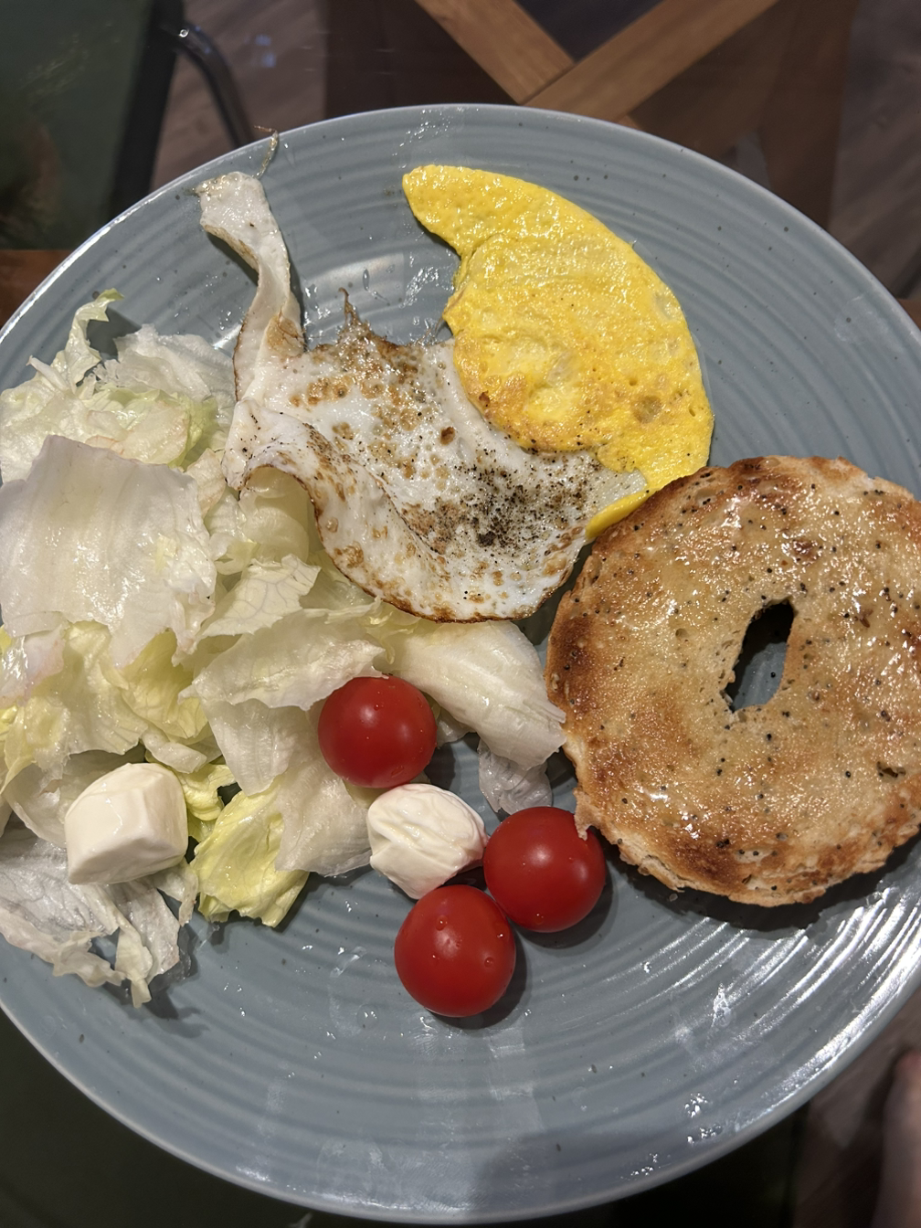 요거트로 아침~ 여전히 꿀은 없다ㅠㅠ. 요거트만으로 아침을 먹으려 했으나 배고파서 베이글에 어제 부르스게타 만들고 남은 토핑을 올렸다.