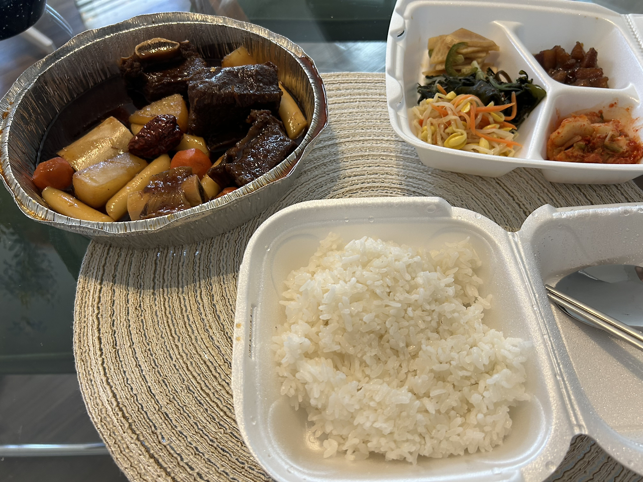 아침~ 오늘은 스크램블 대신 계란후라이~. 점심은 아침부터 먹고 싶은 갈비찜을 배달시켰다. 우버이츠 쿠폰을 이용해서 40% 할인받고 주문했는데 정가가 세금 미포함 33불이더라,,, 할인받았기에 망정이지 외식 물가가 정말 많이 올랐구나 싶었다. 맛있게 먹었다.