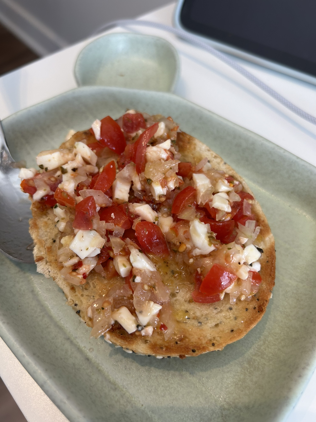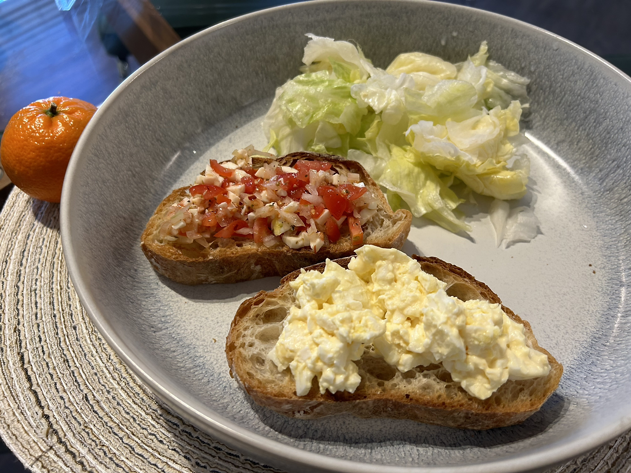 점심을 많이 먹어서 저녁은 (상대적으로) 간단하게 부르스게타와 에그마요 오픈 샌드위치를 먹었다.