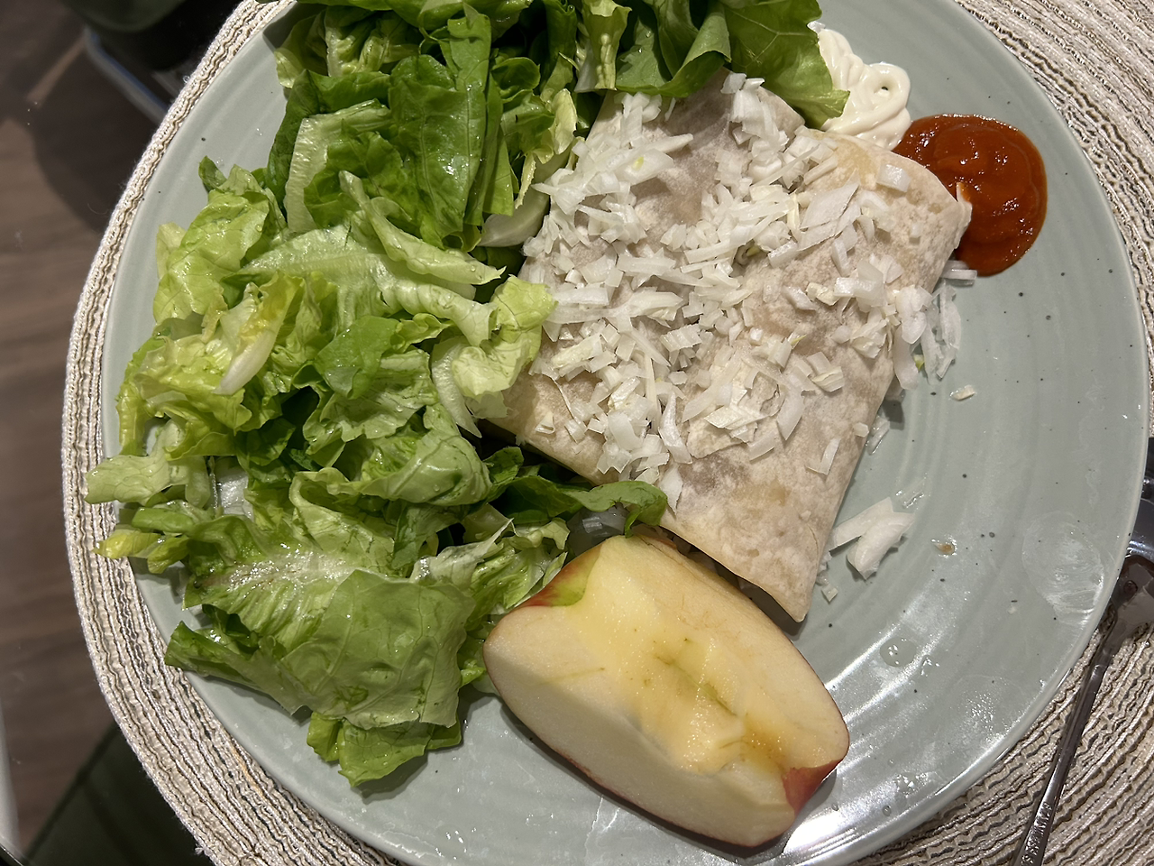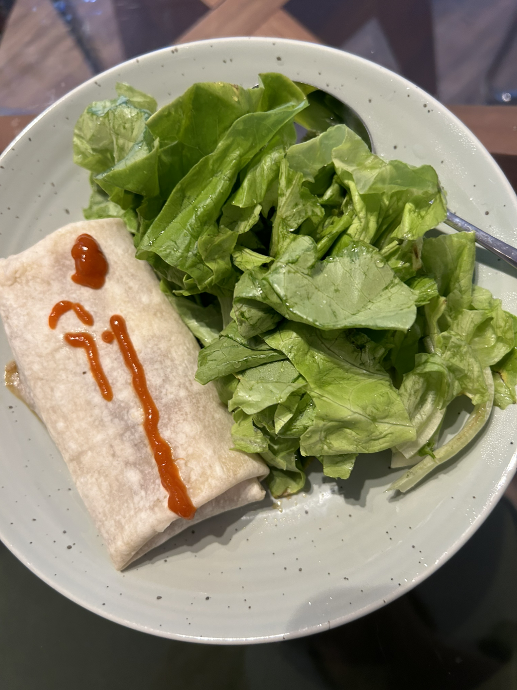 아침은 뷰리토와 야채 가득! 강아지 퍼피 클래스 다녀오고 배가 너무 고파서 퀴도바에서 타코 샐러드를 투고했다. 가격이 전과 똑같은 것 같아 인플레이션에 가격을 안 올렸다고 놀랐는데 양이 줄었다,,,
