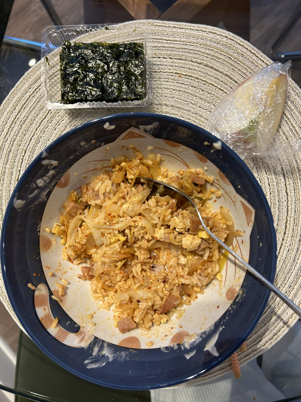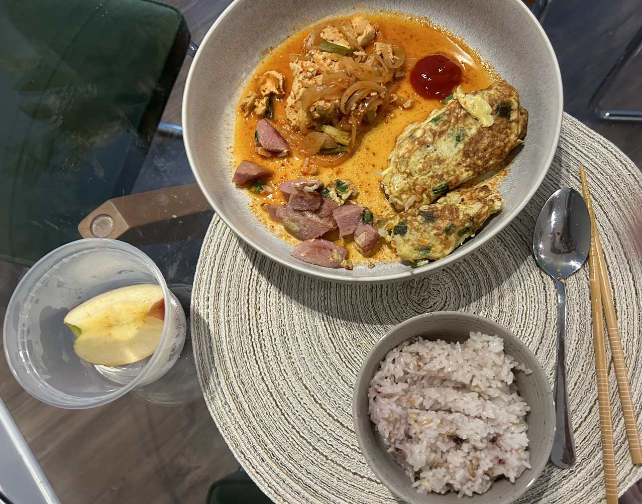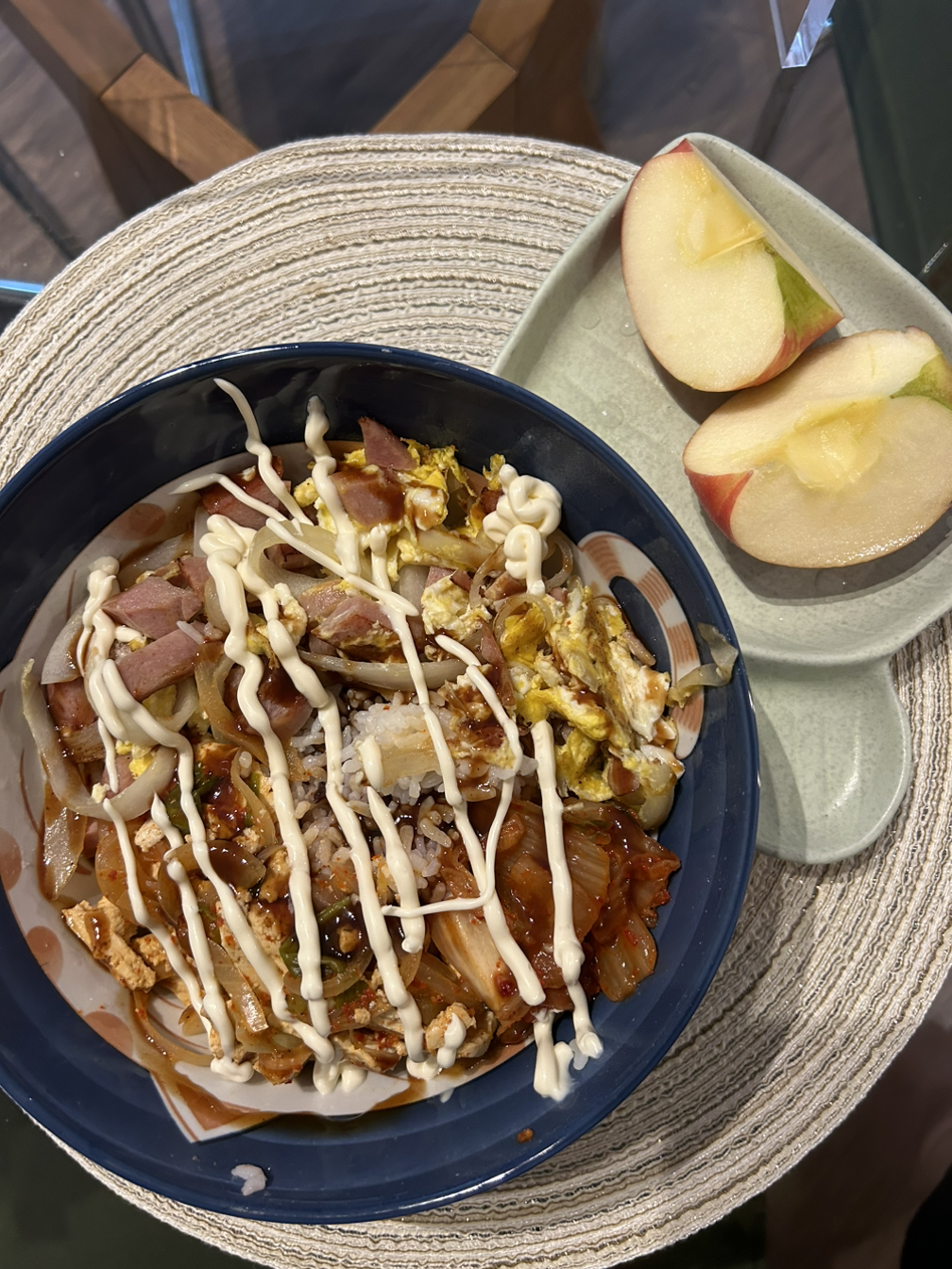 아침을 두 차례 먹었더니 배가 불러서 점심은 스킵. 저녁은 스팸마요덮밥을 먹었다. 배고파서 욕심부렸더니 역시 다 먹진 못했다. 사과도 한쪽만 먹음.