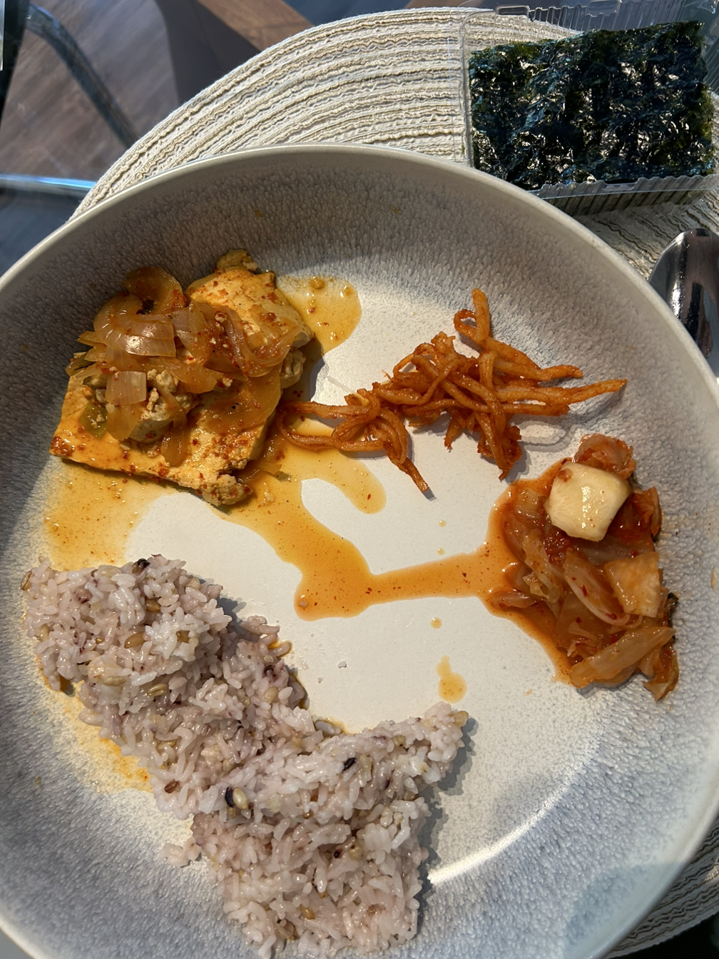 오후 외출했다가 아이스크림 먹고 집에 와서 밥 해서 계란말이랑 스팸 구워서 있던 두부조림과 먹었다.