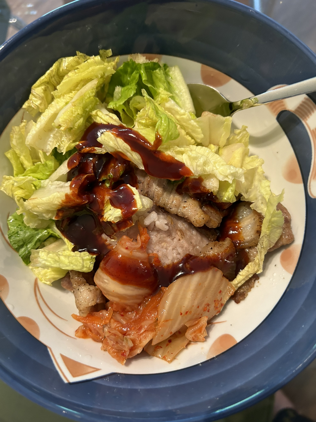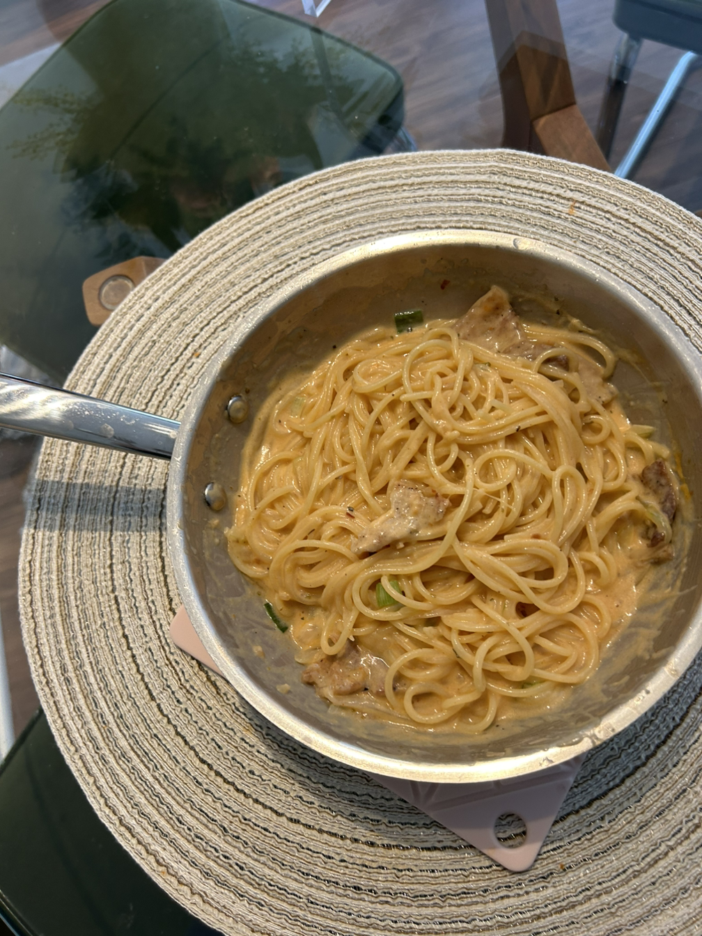 점심은 어제 굽고 남은 삼겹살을 넣은 고추장 크림 파스타~. 점심은 마찬가지로 삼겹살 넣은 비빔밥~.