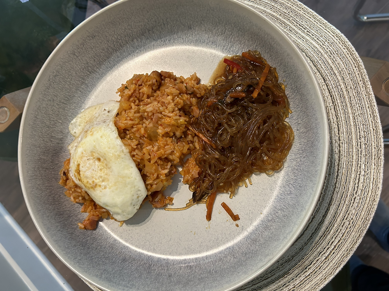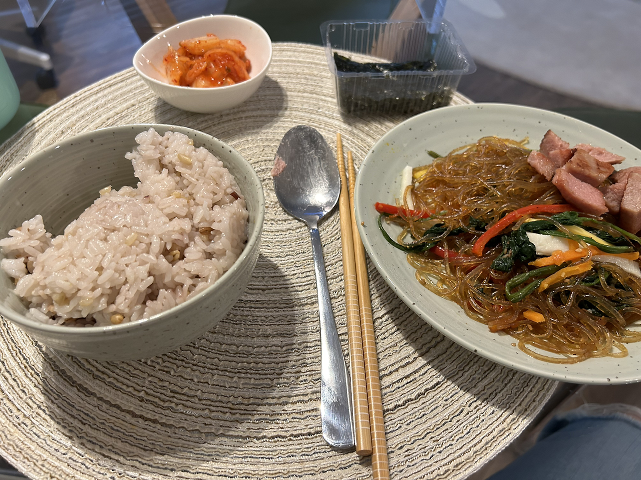 어제랑 같은 아침~. 점심으로 잡채만. 저녁은 김치볶음밥까지 해서 먹었다.