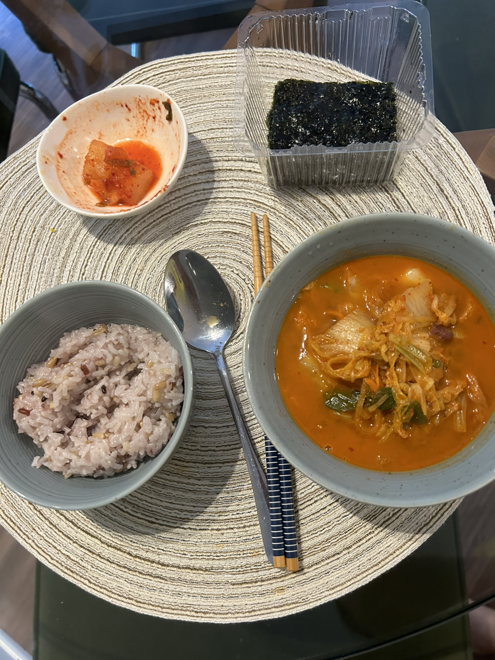 아침으로 몽쉘. 점심은 찍는 걸 깜빡한 것 같다. 저녁은 직접 만든 김치찌개~ 이번에도 성공적.