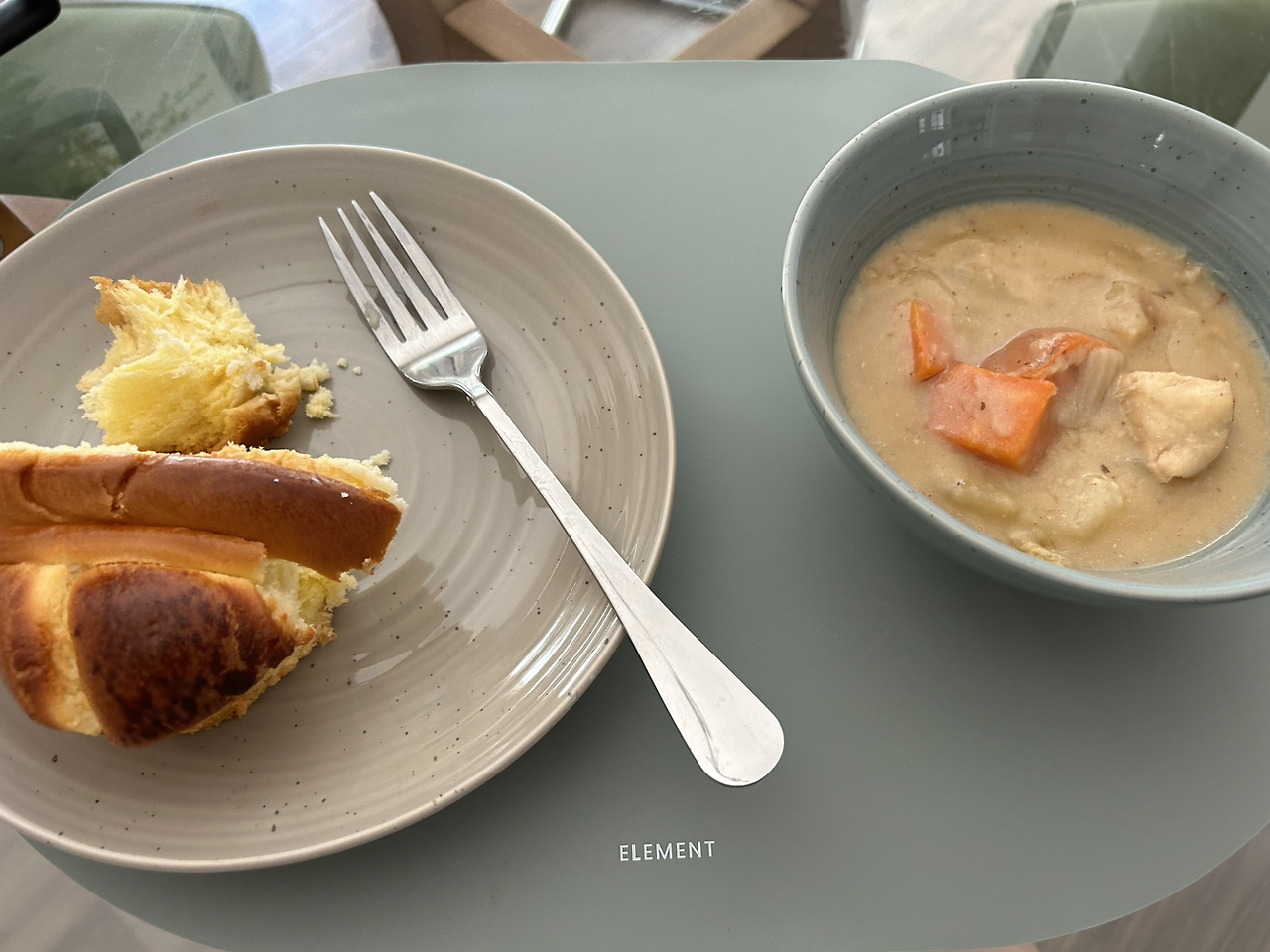 크림스튜와 브리오슈 빵으로 아침. 이 빵이 진짜 맛있다. 홀푸즈에서 샀는데 비싸지만 맛있다. 점심으로는 어제 남은 거에 야채 추가해서 먹었다.