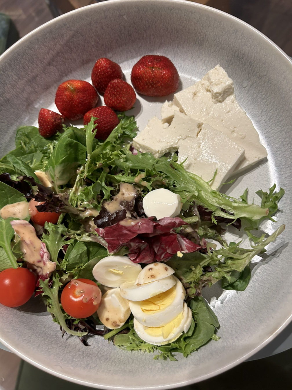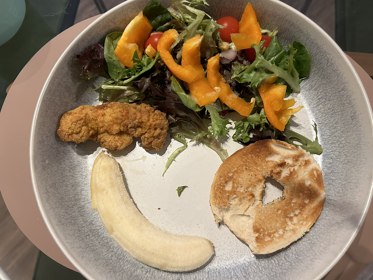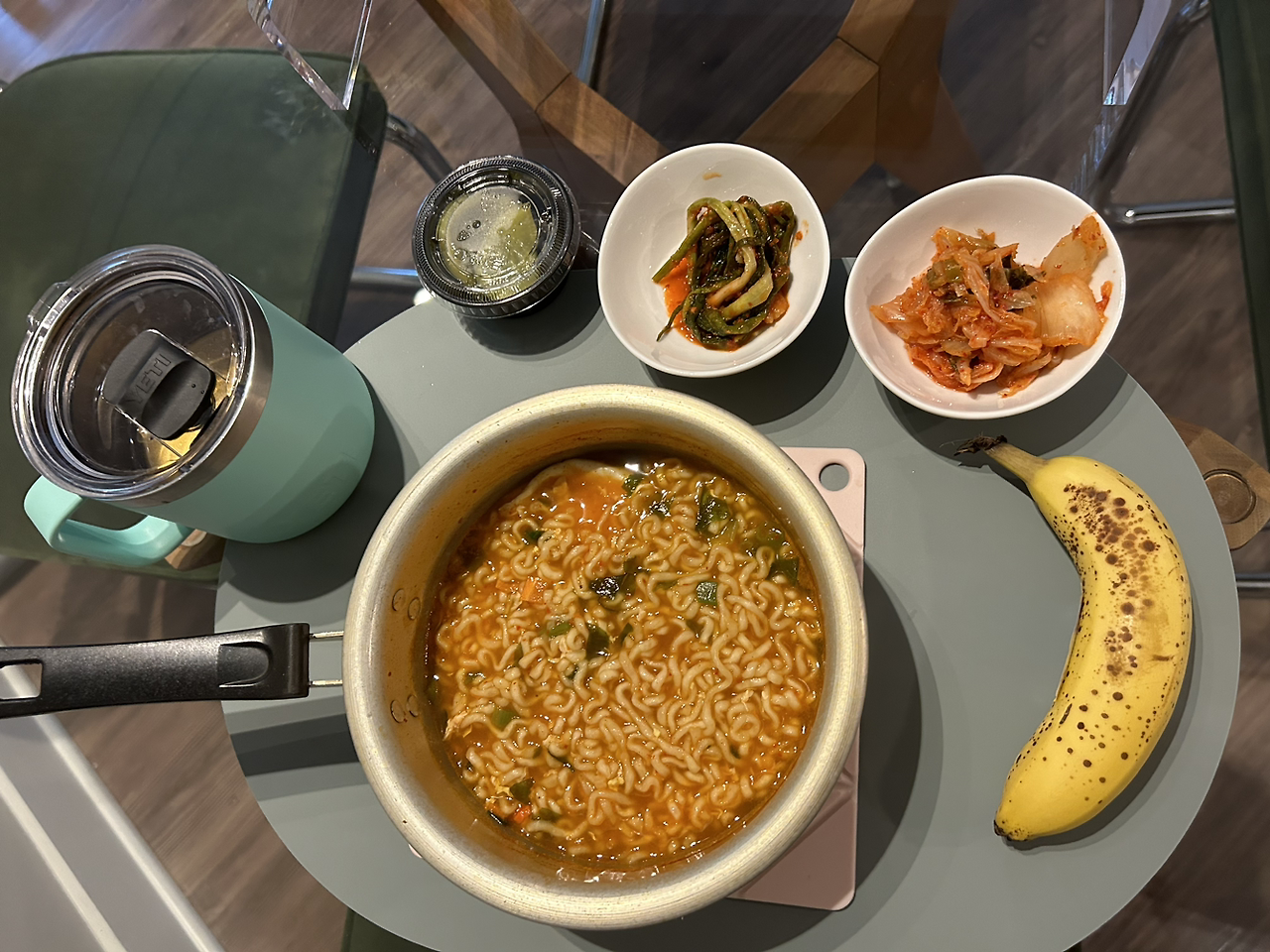 몸무게 보고 충격 먹어서 아침은 샐러드. 간식은 바나나. 저녁은 예전에 만들어둔 김치찌개. 저녁도 남은 떡볶이.