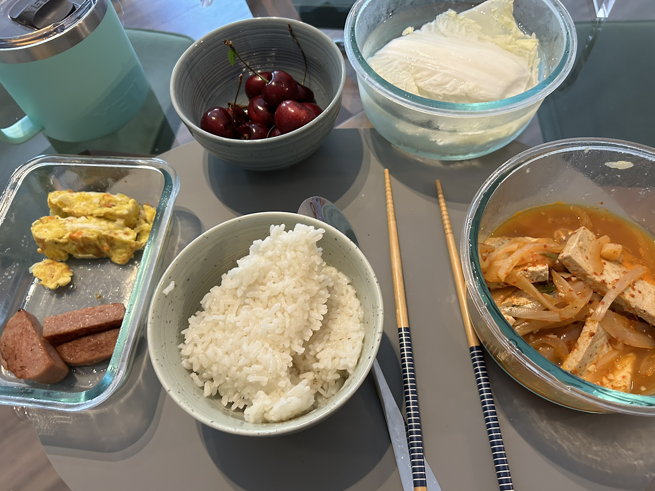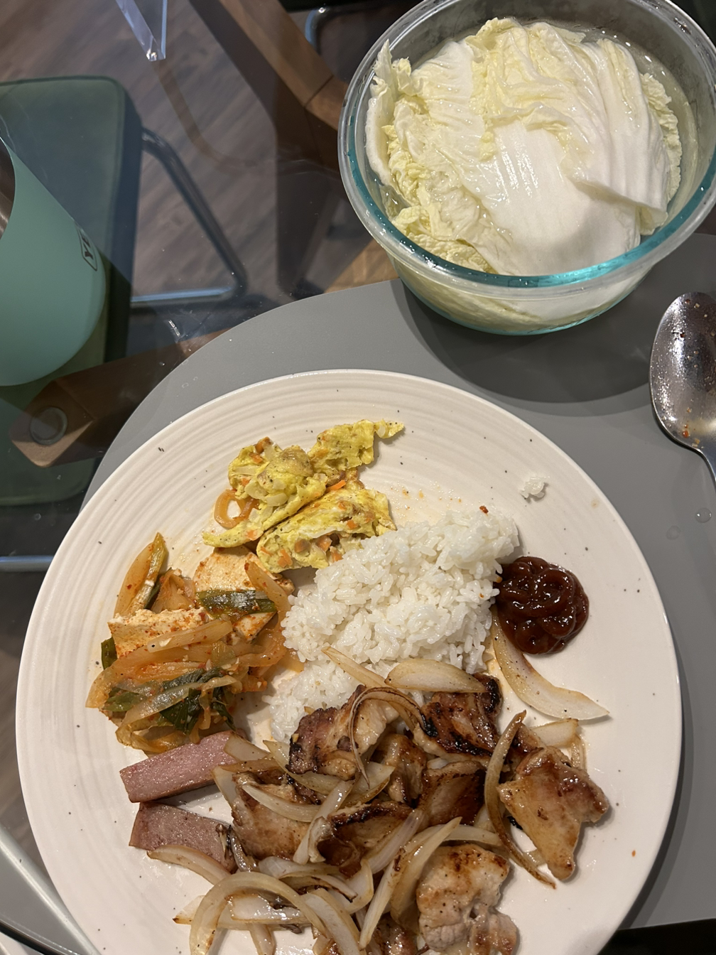 콘후레이크로 아침~. 어제 남은 레프트 오버 샐러드로 점심. 간식으로 체리 먹고 삼겹살! 소금물에 절인 배추가 맛있었다. 너무 덥고 습해서 샐러드 채소가 빨리 상하니까 요즘은 배추나 양배추 밖에 못 먹고 있다ㅋㅋ. 웃기다. 아니 사실 웃기지 않다 습한 거 너무 싫어,,
