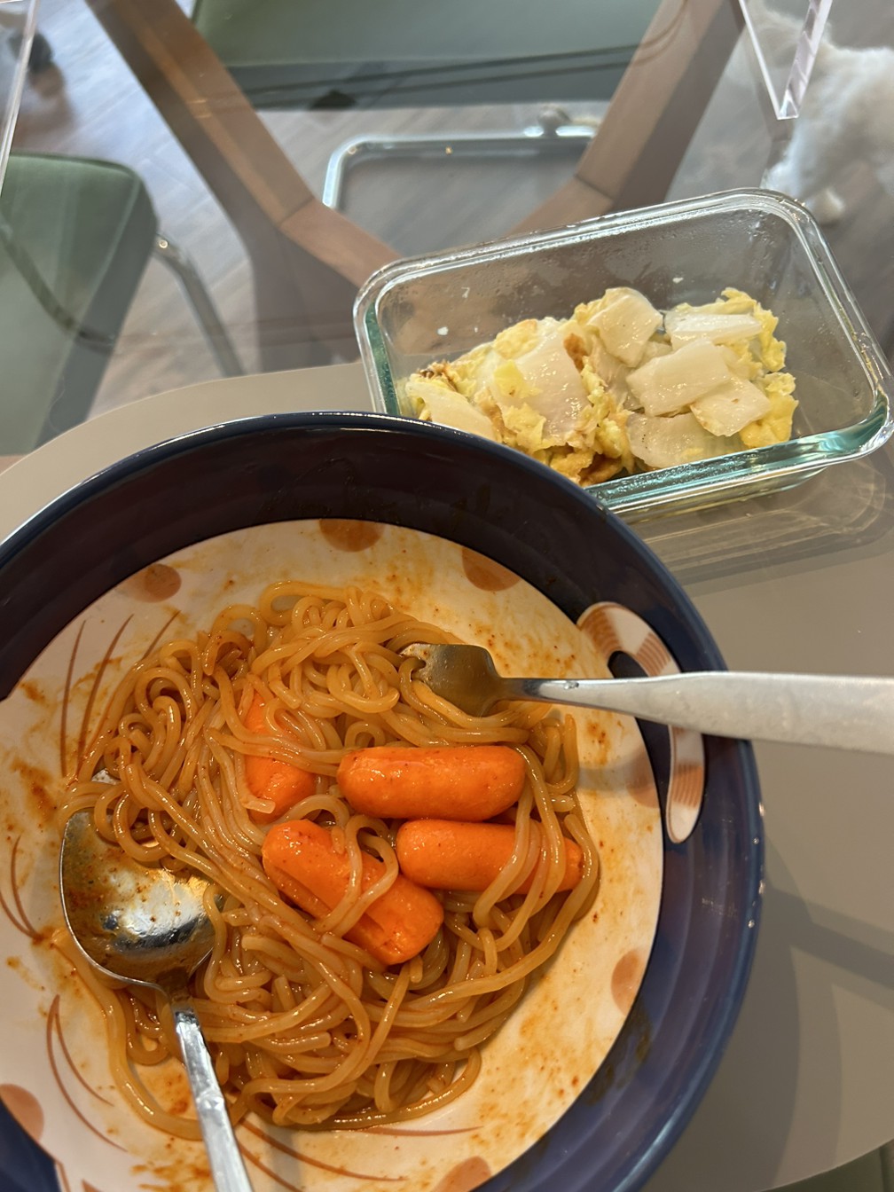 점심은 쫄면. 당근을 잘라 넣었어야 하는데 피곤해서 통째로 넣었다. 어차피 맛과 영양소는 같을 테니까,,