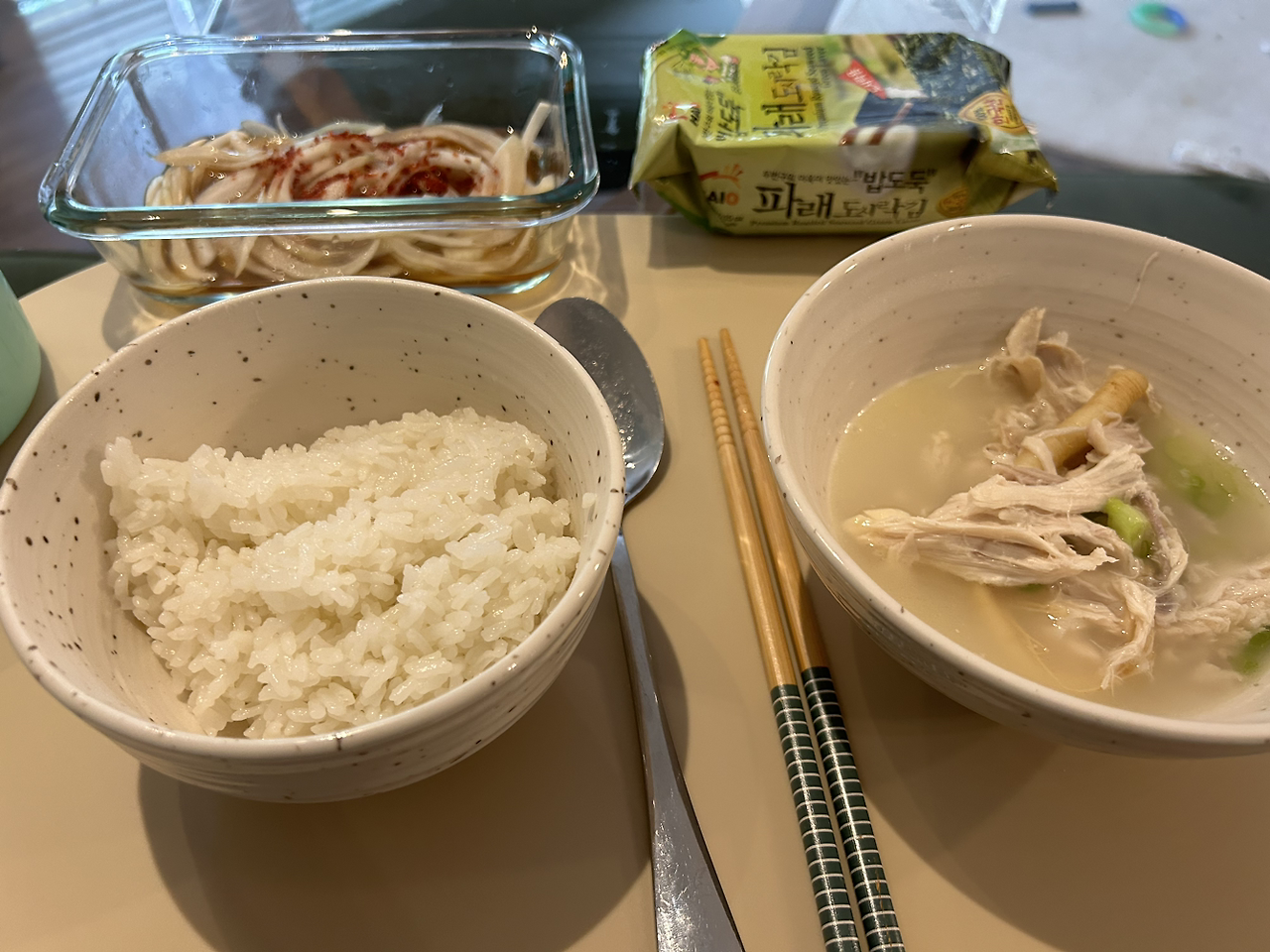 빵 딸기잼 계란 프라이. 점심은 미고랭에 계란프라이. 저녁은 하림 삼계탕. 국물이 적고 닭이 맛있었다.
