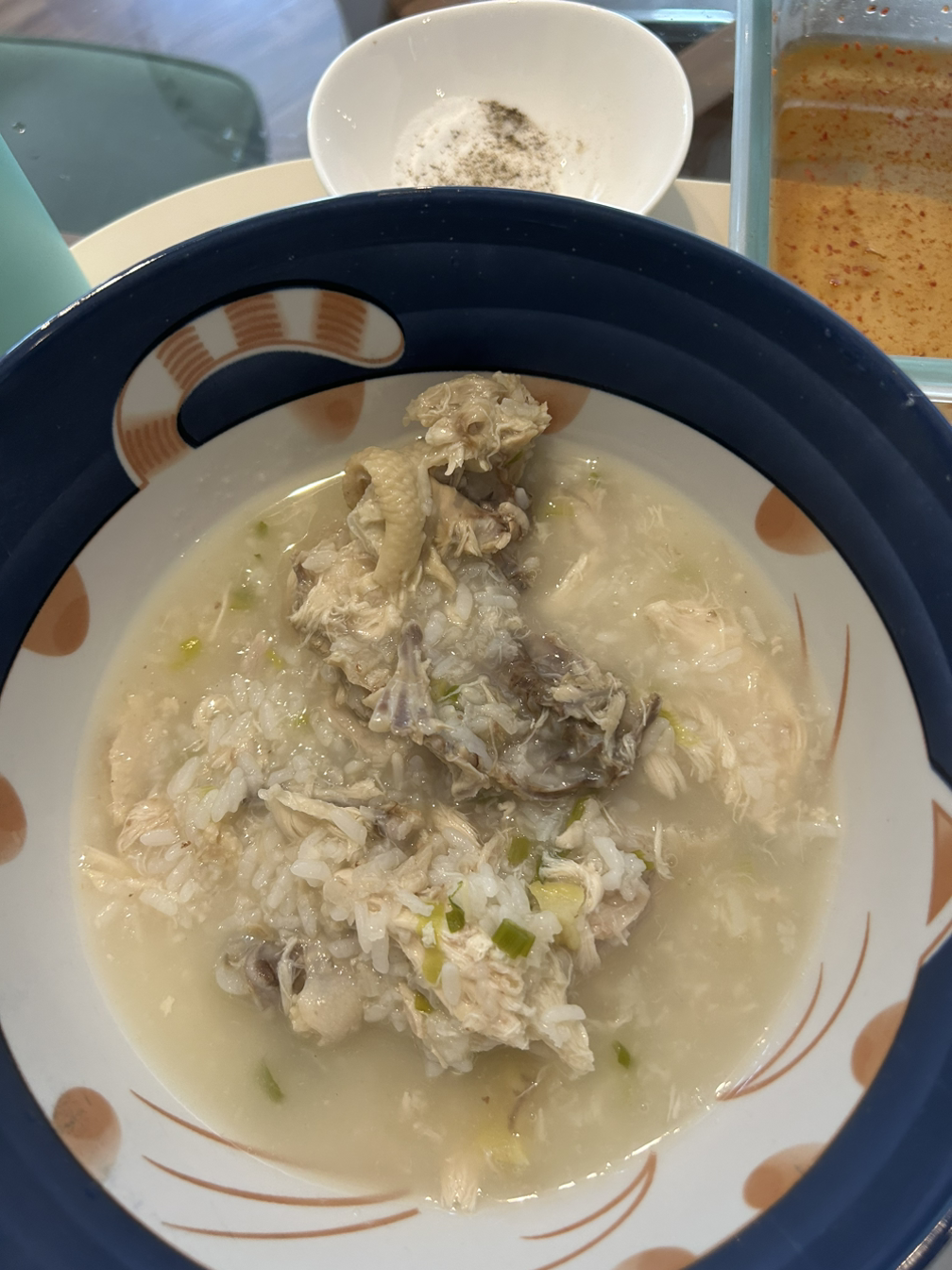 간단하지만 맛있는 아침. 빵 굽고 올리브유 두르고 계란 프라이! 점심은 삼계탕인 듯 닭죽인 듯 삼계탕인 것.