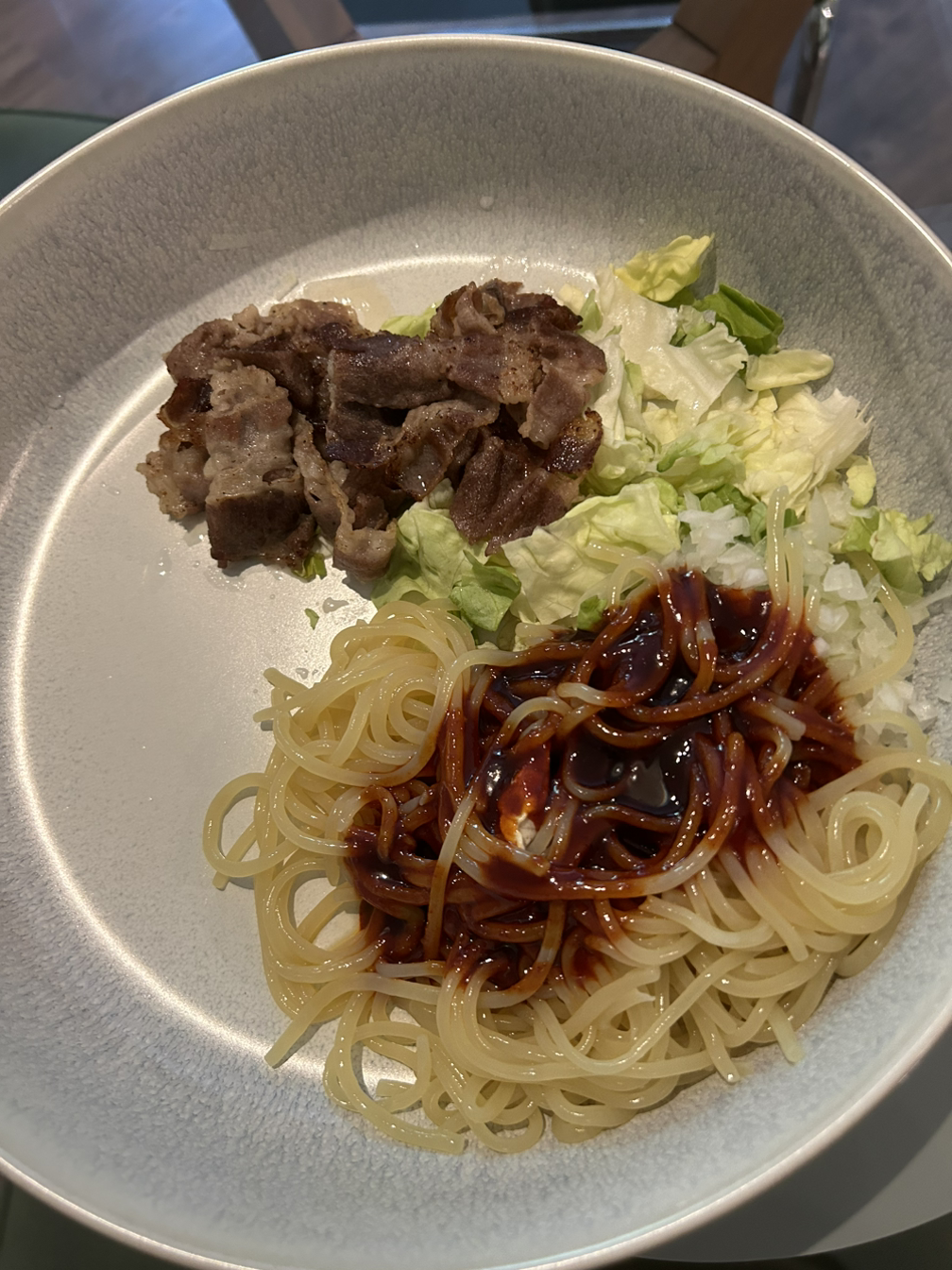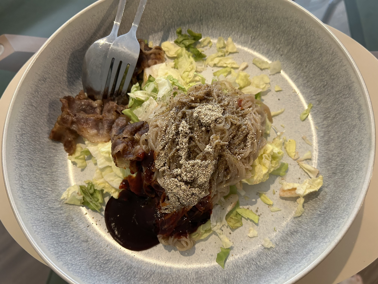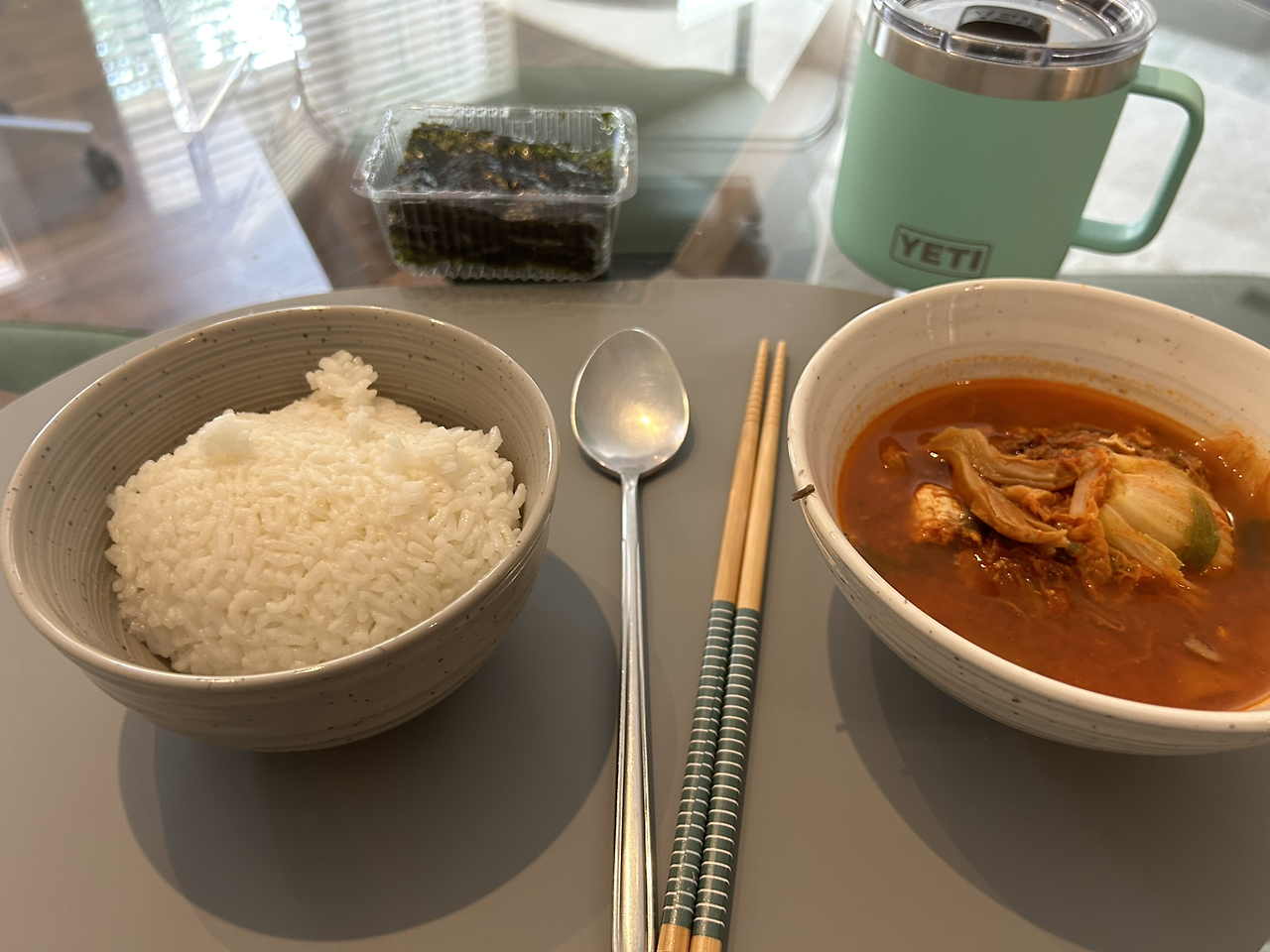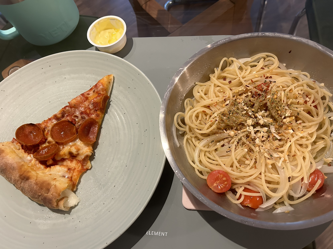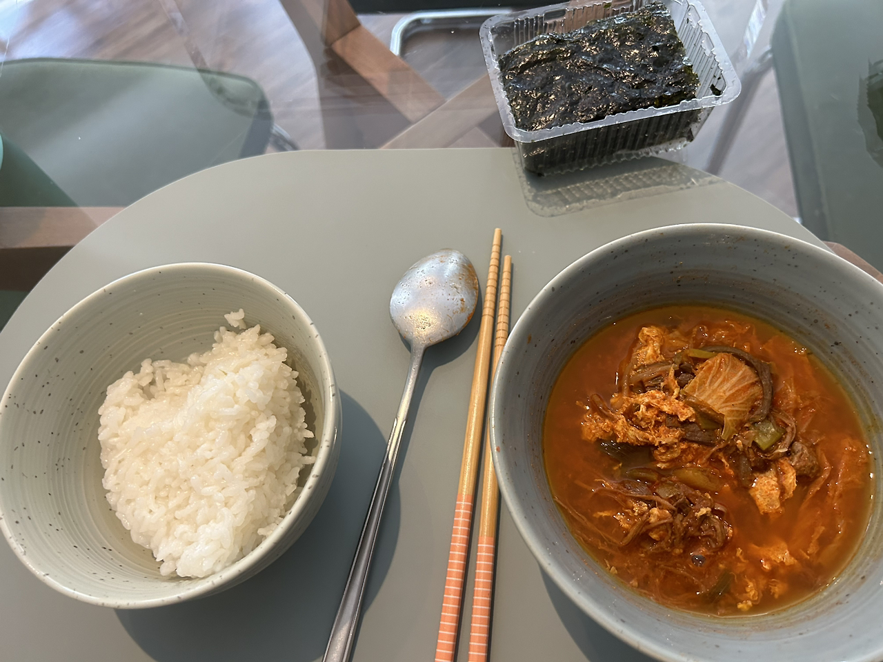 주말이니까 나름 신경 써서 사과도 자르고 계란프라이도 올렸다. 발사믹 글레이즈가 다 했다. 점심은 전에 먹고 얼려둔 코스트코 육개장. 계란과 파 배추는 내가 추가했다. 저녁은 알리오올리오와 피자.