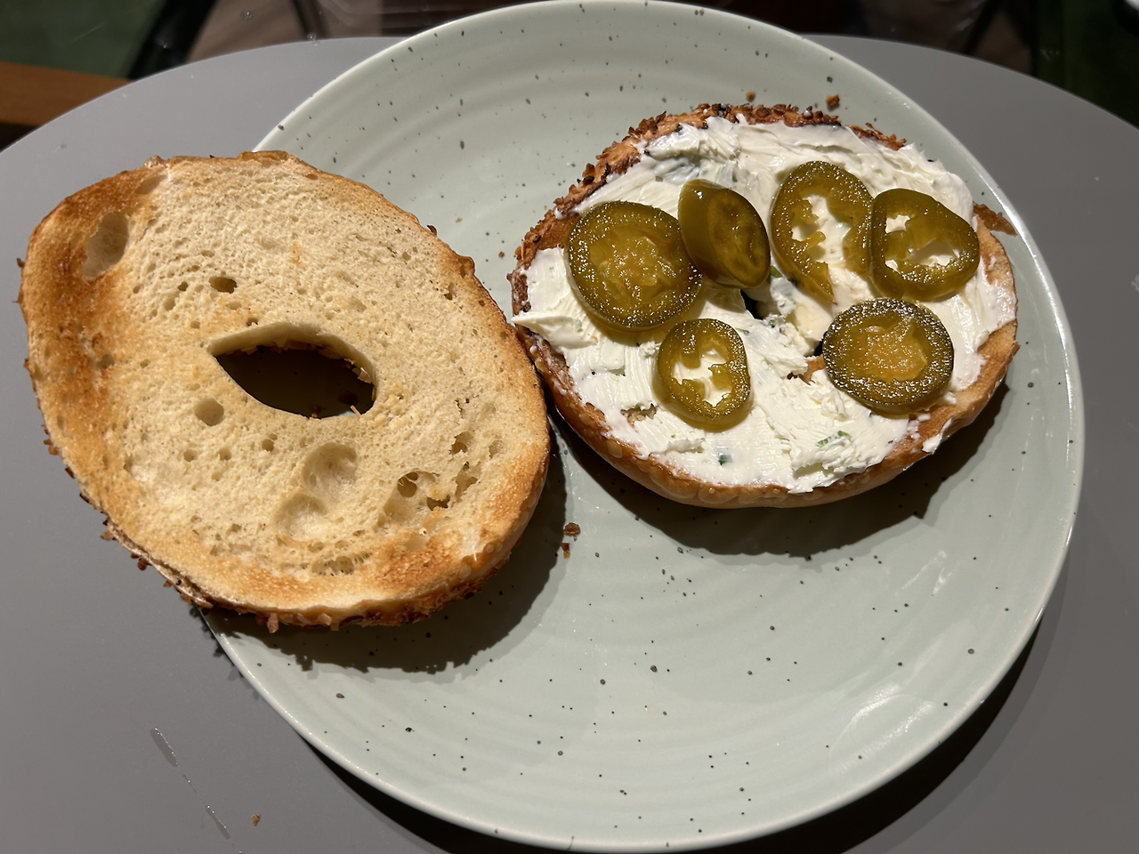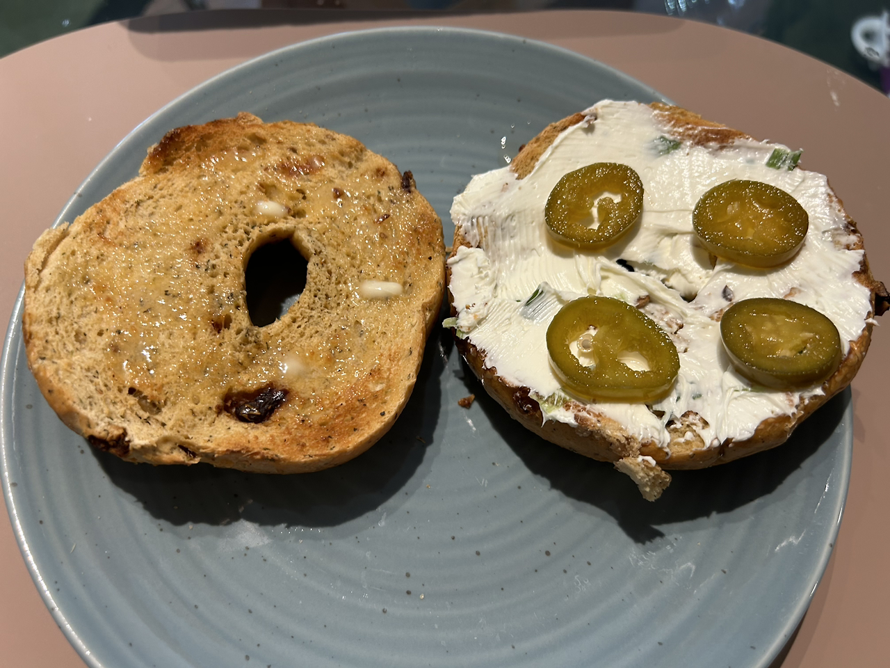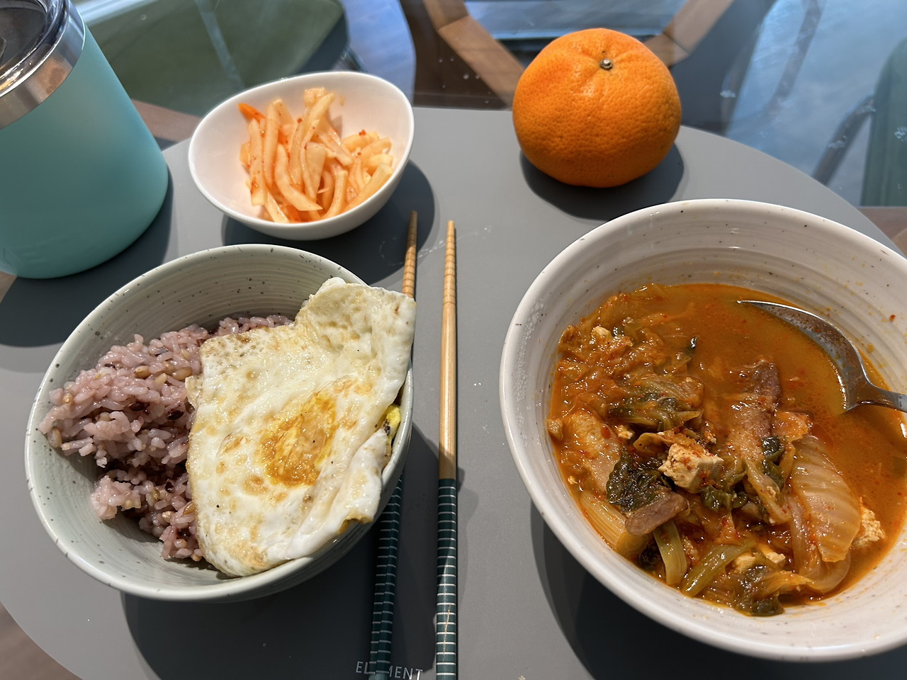 할라피뇨 넣은 베이글~~. 점심은 한식으로~. 김치찌개 한 번에 왕창 만들어놓고 소분해서 냉동실에 뒀다가 꺼내먹는데 간편해서 좋다. 자주 해야지.