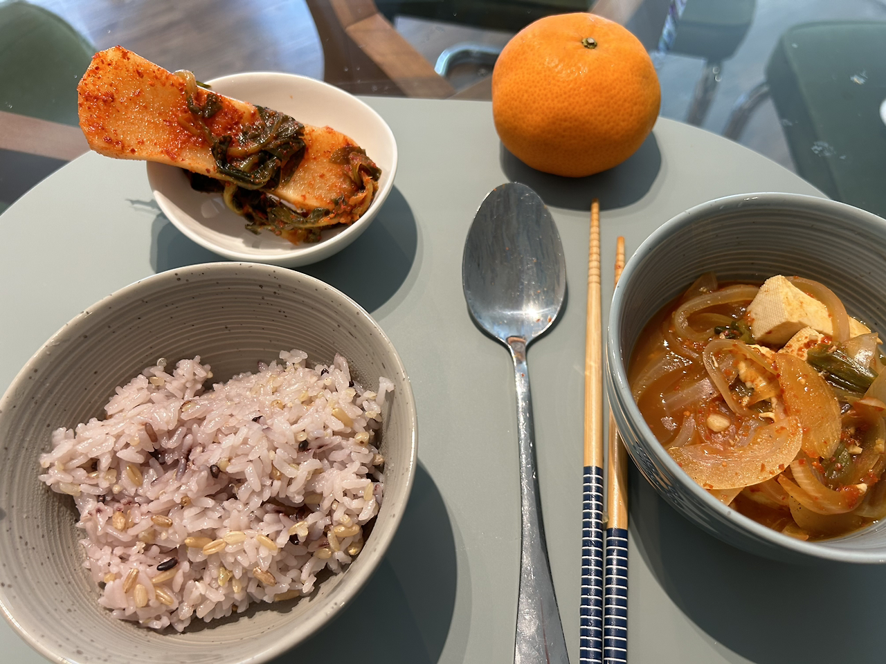 어제 먹방 마니아들에게만 뜬다는 생로병사 알고리듬을 보고 반성했다. 아침만큼은 풀을 먹겠다 다짐했다. 일단 오늘은 수행. 점심도 나름의 건강식이랄까? 오른쪽은 두부조림이다. 뭔가 한식을 먹으면 건강한 느낌.