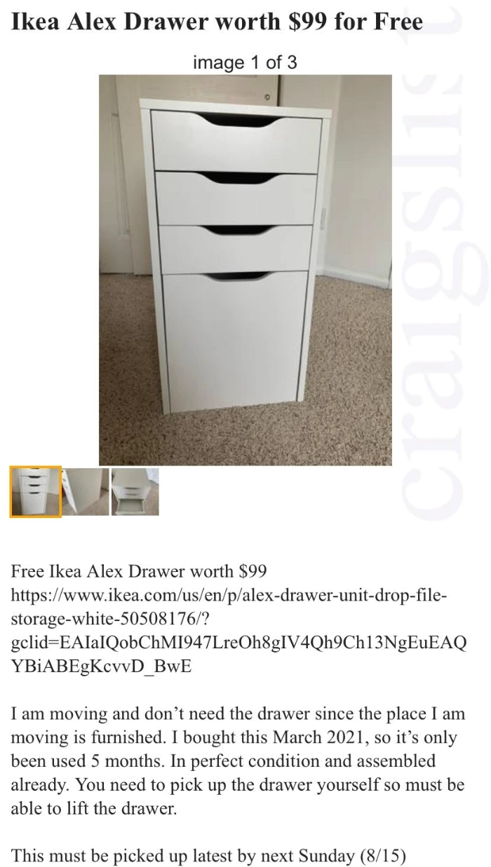 결국 나는 미국 당근 마켓, Cragislist에 서랍장을 공짜로 내놓기로 했다. 어차피 중고기에 판다고 해도 큰돈을 벌 수 있는 것도 아니고 이사 가기 전까지 일주일도 안 남았기에 빨리 처리하기 위해서는 공짜로 내놓는 게 좋겠다는 판단에 밑의 포스팅을 낸 것인데, 역시 공짜로 내놓는 게 정답이었는지 5분 만에 10명에게 연락이 왔다. 오늘 바로 픽업하겠단 사람도 꽤 되었다.