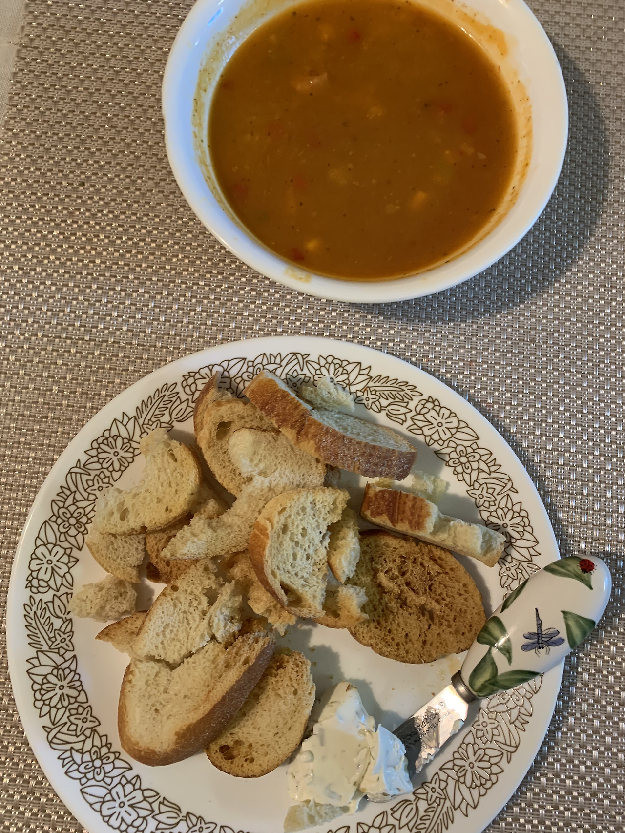 점심으로는 마트에서 산 통조림 스프와 빵, 그리고 크림치즈를 먹었다. 저번 주부터 크림치즈가 너무 먹고 싶었는데 드디어 먹게 되어서 더 맛있는 것 같다. 빵은 자투리 빵 세일하는 것을 집어왔다. 어차피 맛은 다 똑같다.