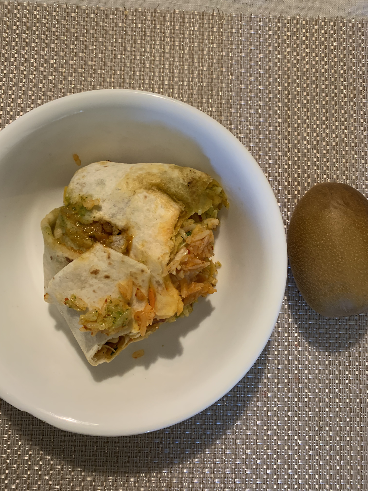 팀 런치라 외식을 했다. 회삿돈으로 먹는 공짜 점심이 제일 맛있어~. 퓨전 한식을 먹었는데 점심을 먹고 남은 것은 저녁으로 먹었다. 코리안 쌈 뷰리토라는데 김치볶음밥과 양념치킨을 또띠아로 싼 맛이다. 맛있고 공짜라 더 맛있다. 간식으로는 키위, 그리고 영양제