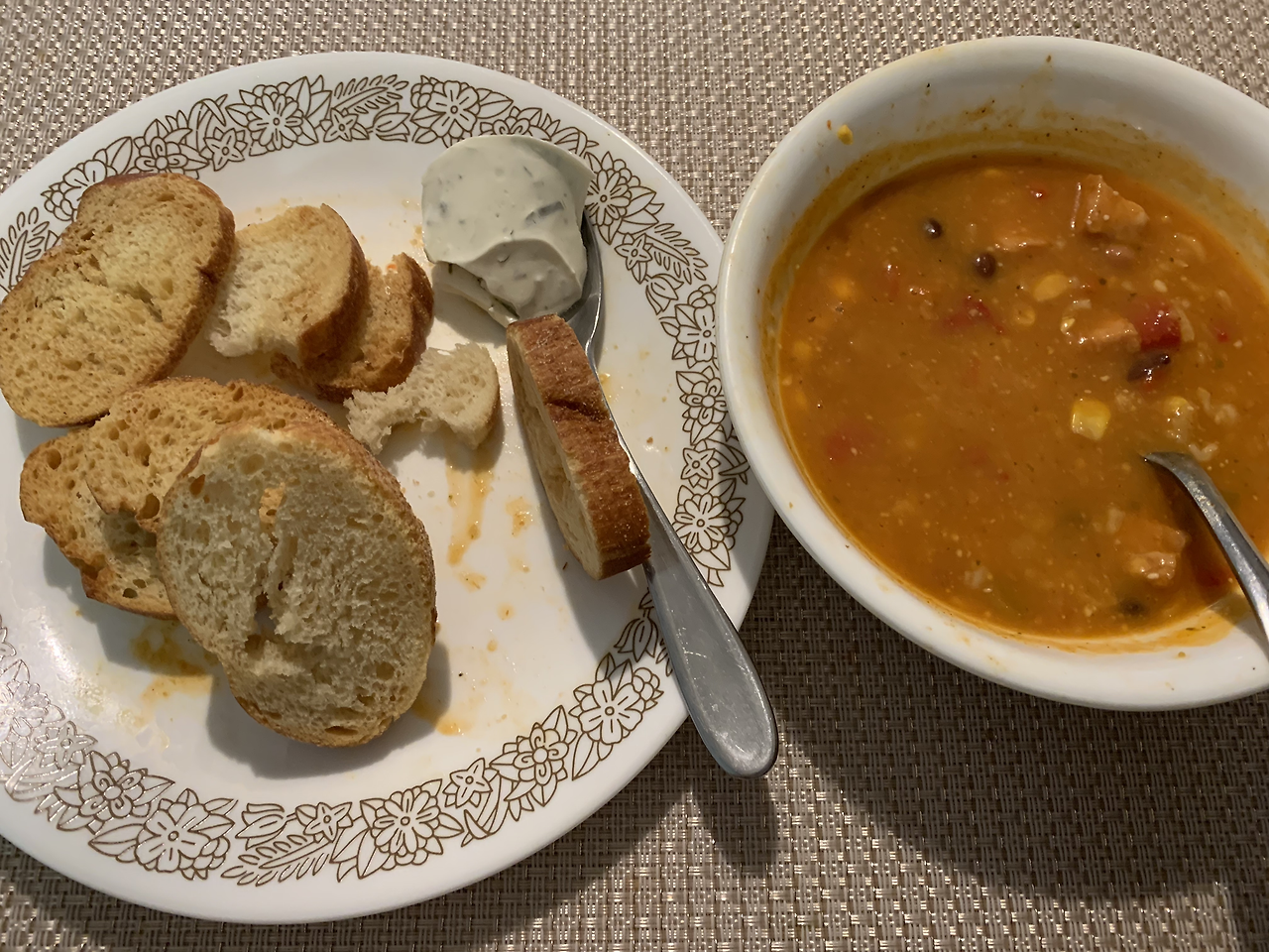 크림치즈 왜 이렇게 맛있지. 아침으로 베이글에 크림치즈 그리고 데코용으로 레드 페퍼를 뿌렸다. 점심 메뉴는 어제와 동일하다. 통조림 스프라 큰 기대 안 했는데 나름 건더기도 있고 짜지 않아서 좋았다.
