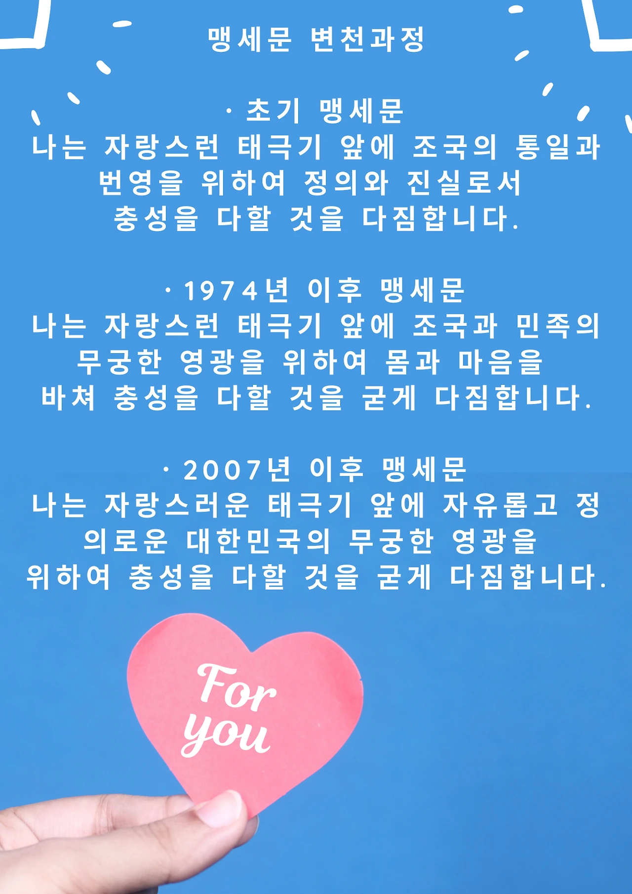 “나는 자랑스러운 태극기 앞에 조국과 민족의 무궁한 영광을 위하여 몸과 마음을 바쳐 충성을 다할 것을 굳게 다짐합니다.” (1974년 이후 맹세문이 내가 기억하는 내용이다.)