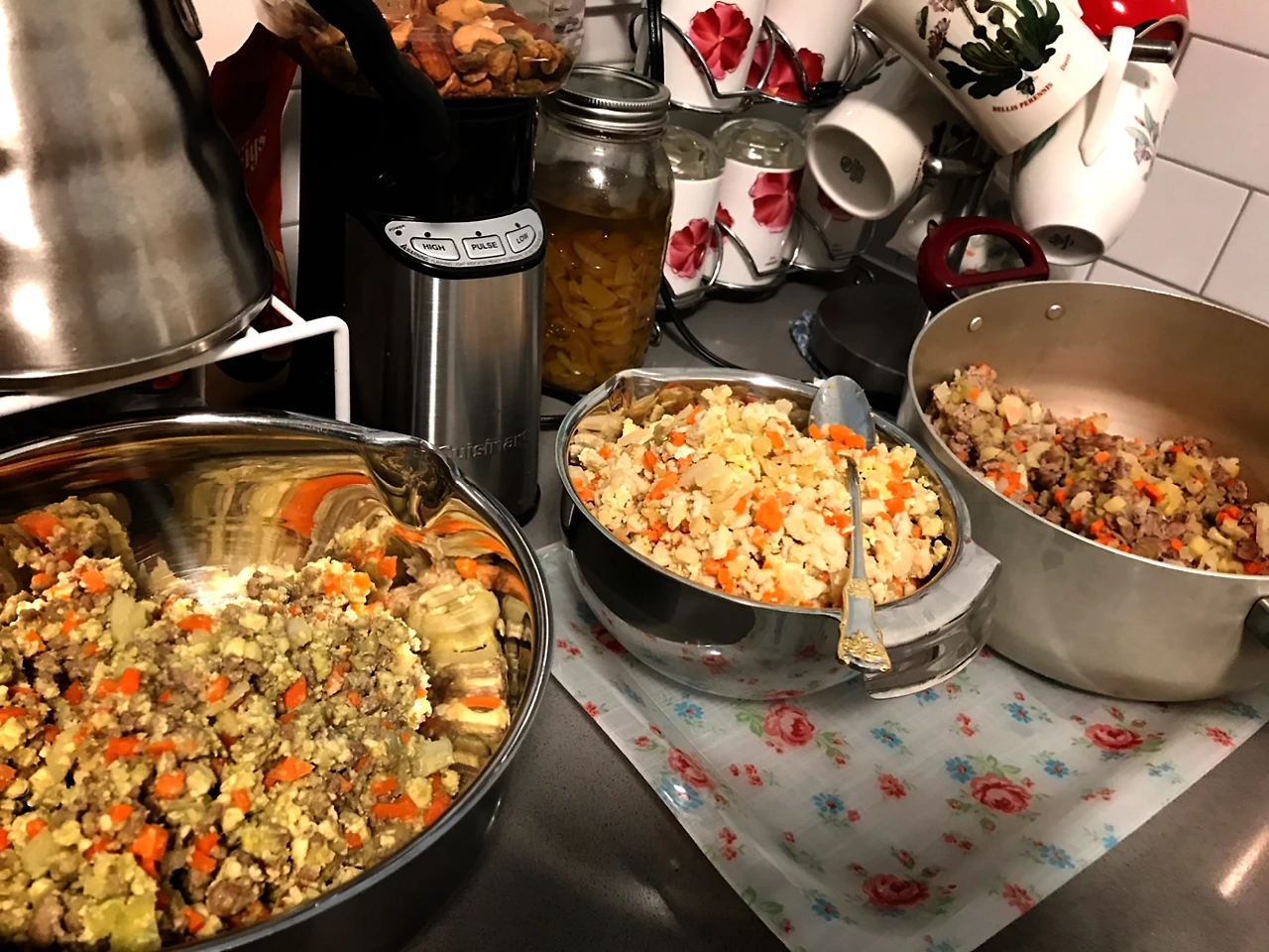 일요일은 모이 음식을 만들었다. 보통 한 번에 3-4주치를 만드는데 소, 돼지, 닭, 터키를 각각 다른 맛으로 42견분을 만들었다. 2시간 소요.