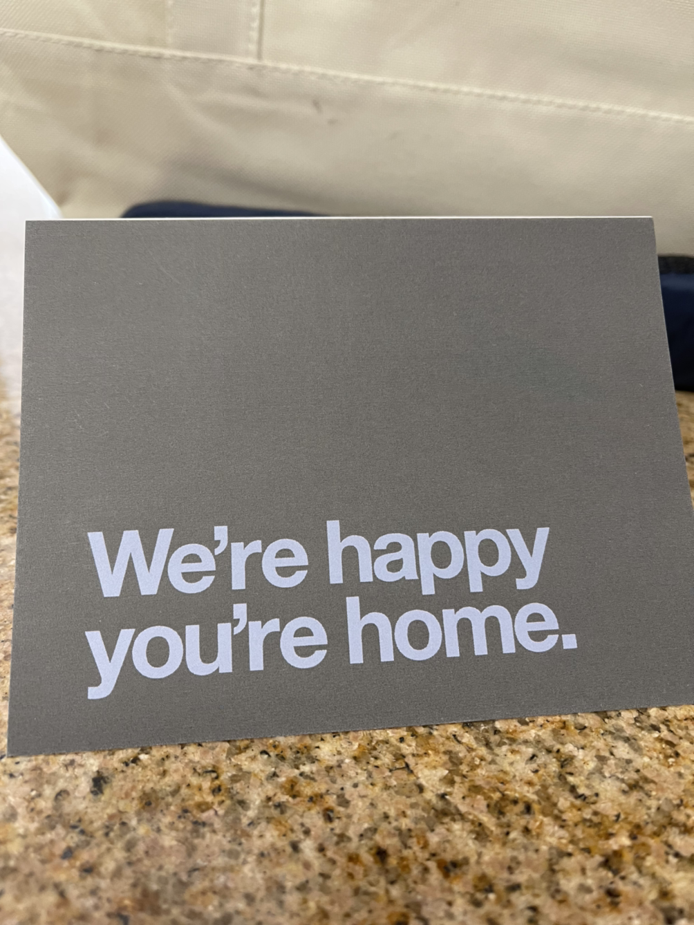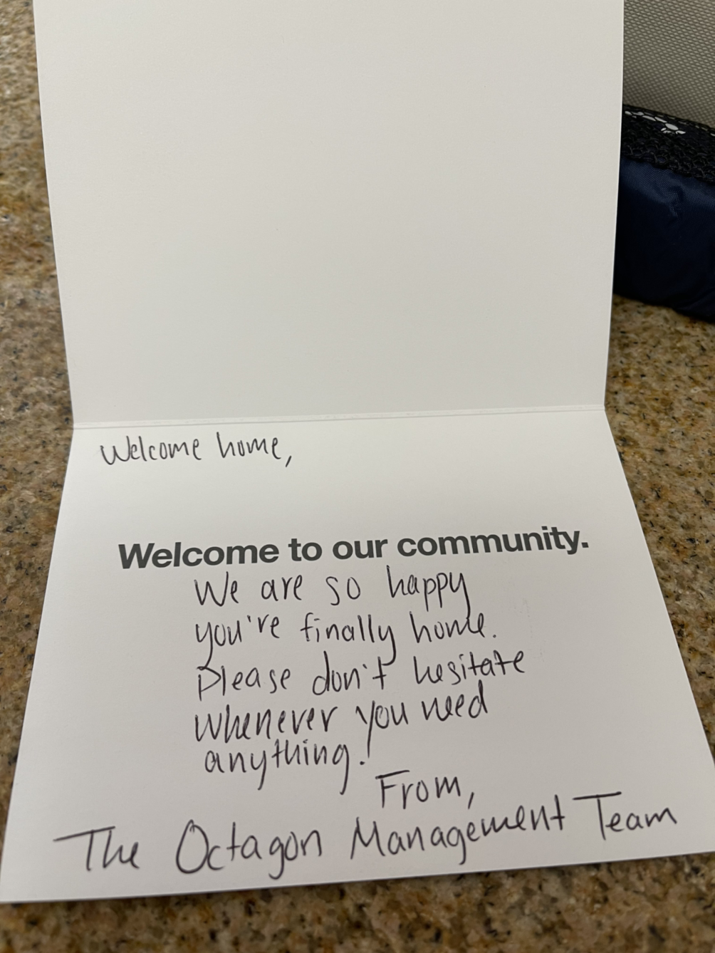 남편이 이사짐 센터 아저씨들과 짐을 싣는 동안 내가 먼저 새집으로 가서 서류에 사인하고 인스팩션을 했다. 도어맨 뿐 아니라 모든 관계자들이 친절하게 웰컴 해주었고 집에 들어오니 웰컴 카드와 선물도 놓여 있었다.