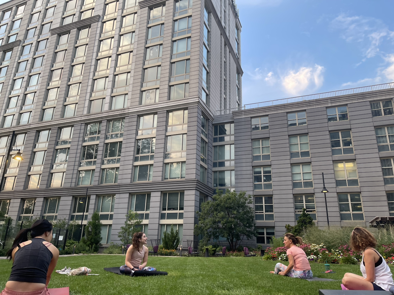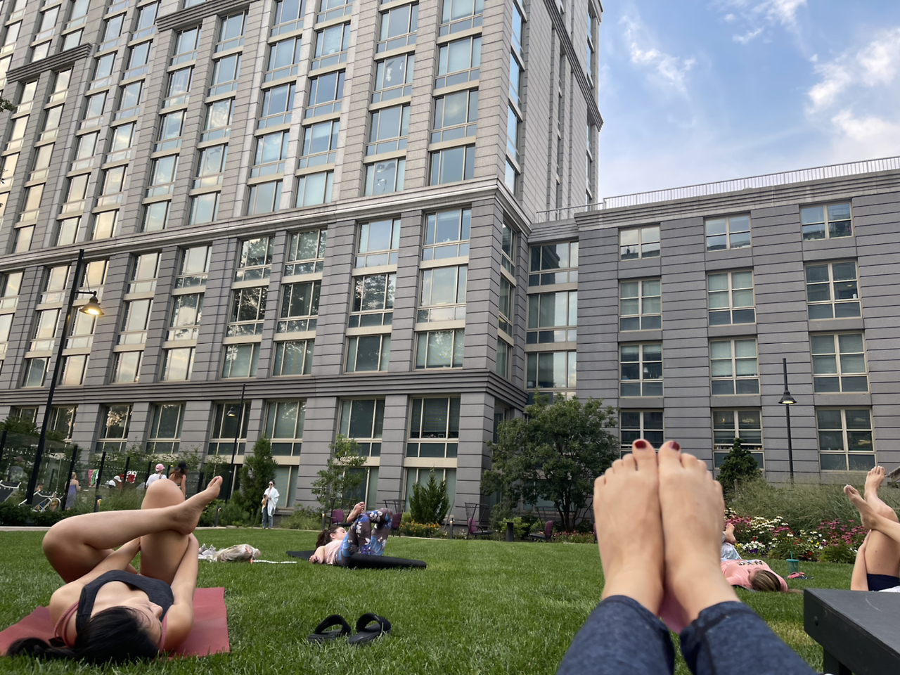 지난주 토요일 fitness는 너무 더워서 실내에서 했는데 어제 처음으로 신청한 요가는 아파트 밖의 Courtyard에서 했다.
