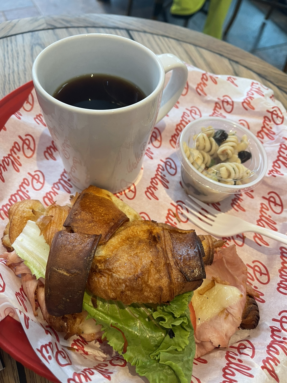 타운이 크지 않아 걷다 보면 다 볼 수 있을 것 같아서 천천히 다니기로 했다. 게다가 비가 오고 바람도 불었다. 퀘벡에 가면 꼭 잼을 사 와야 한다고 추천받은 베이커리 Paillard에 갔다. 에그햄 크루아상과 커피 콤보를 먹고 싶었는데 30분 전에 다 팔렸다고 해서 햄치즈 크루아상과 커피를 시켰다. 실내 인테리어도 별로이고, 시장처럼 시끄러워서 큰 기대를 하지 않았는데 다행히 맛이 있었다. 커피는 싱거웠음.