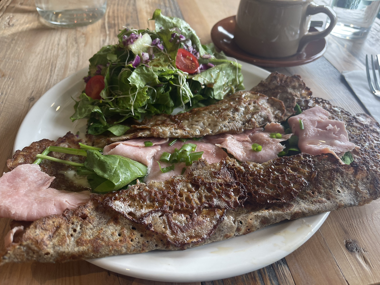 마치자마자 바로 숙소 근처에 리뷰가 좋은 식당에 갔다. 금-일요일만 오픈하는 곳이라 기회를 놓칠 수가 없었다. 오가닉 재료를 사용하여 주인이 모두 직접 만드는 베지테리언 식당인데, 하나하나 재료와 메뉴에 대해 설명을 해주었다. 햄, 치즈, 야채를 넣어 만든 크레페와 샐러드가 곁들여 나오는 음식과 커피를 주문했다.