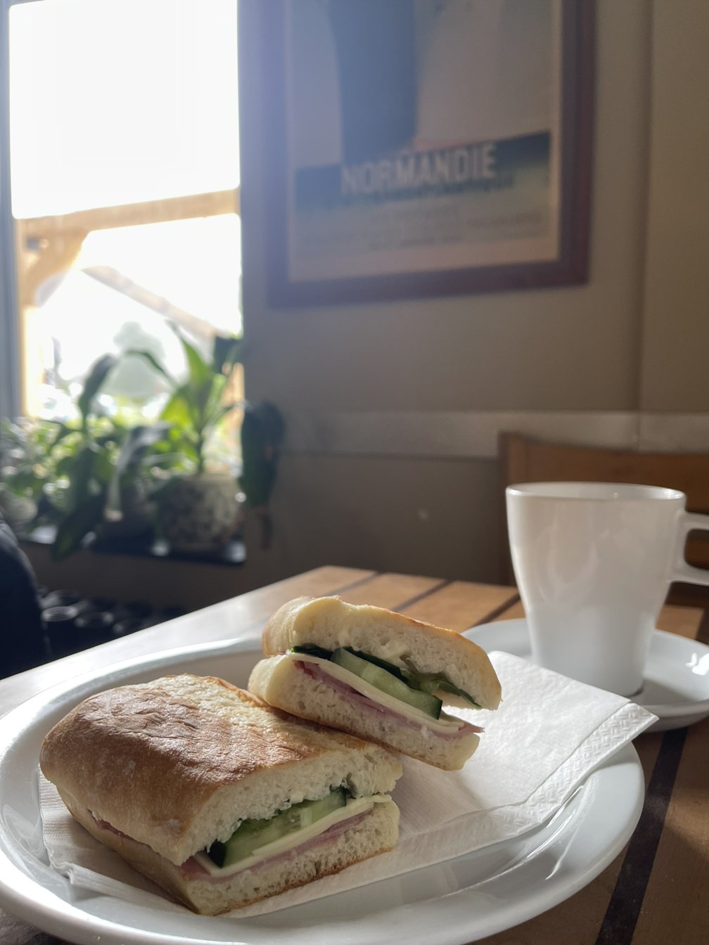 오늘 Lévis를 떠나 퀘벡 시티로 숙소를 옮기는 날이라, 마지막으로 들러 커피와 샌드위치를 먹고 두 가지 다른 맛의 원두를 구입했다. 내가 원하는 맛을 설명했더니 신중하게 추천해 주었다. 샌드위치는 햄, 치즈, 오이 그리고 상추입 한 장이었지만 빠삭한 바케트 빵과 담백하게 어우러져 과하지 않게 먹을 수 있었다.