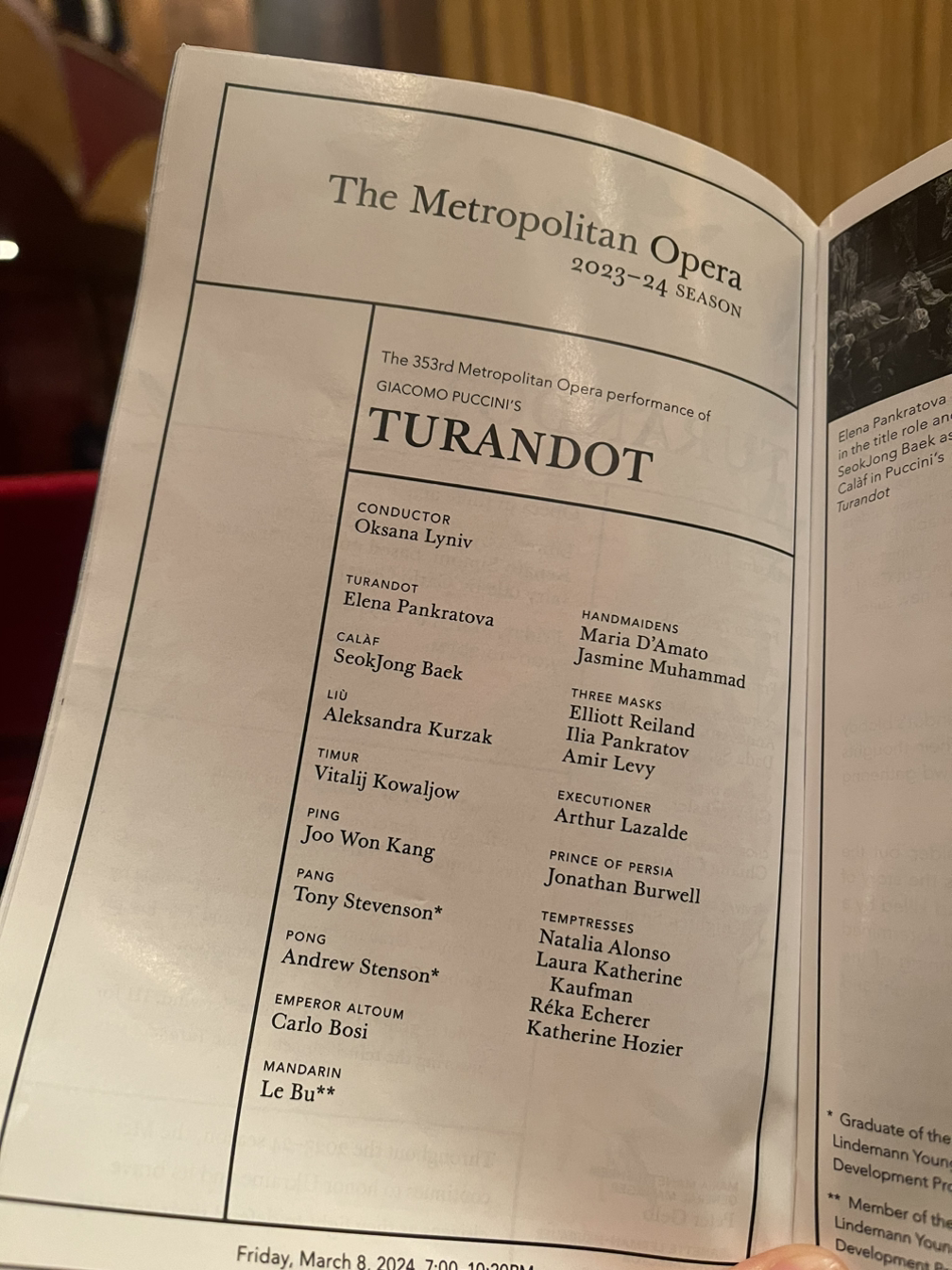 오늘은 오랜만에 남편과 오페라를 보러 왔다. 몇 년 전 인연이 되어 NYCP 볼리비아 투어에 같이 갔었던 테너 백석종 님이 주인공으로 등장하는 Turandot. 메트의 오페라가 실망스럽지 않은 이유는 디테일한 연출과 무대세팅이 어마어마하다. 그리고 너무 멋있게 노래하는 남주를 안다는 것만으로도 영광이었다.