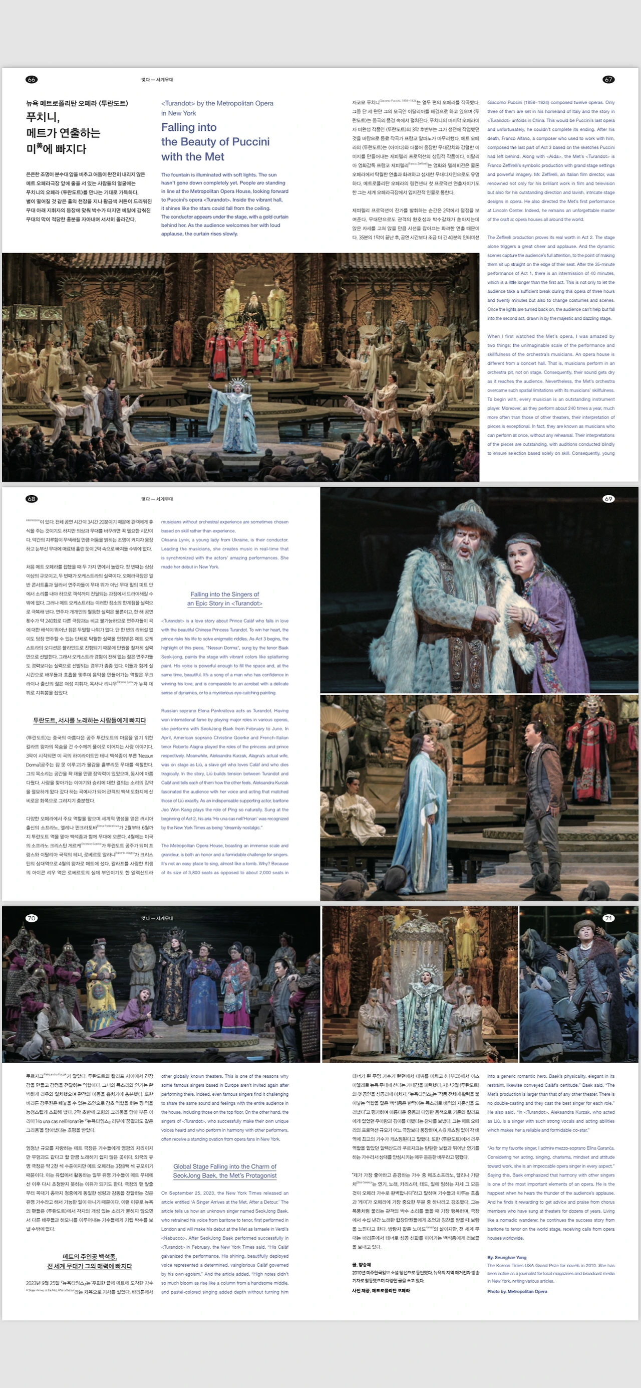 은은한 조명이 분수대 앞을 비추고 어둠이 완전히 내리지 않은 메트 오페라 극장 앞에 줄을 서있는 사람들의 얼굴에는 오늘 밤을 풍성하고 우아하게 채워줄 푸치니의 오페라, 투란도트를 만나는 기대로 가득하다. 별이 떨어질 것 같은 홀의 천장을 지나 황금색 커튼이 드리워진 무대 아래 지휘자의 등장에 맞춰 박수가 터지면 베일에 감춰진 무대의 막이 적당한 흥분을 만족시키며 서서히 올라간다.