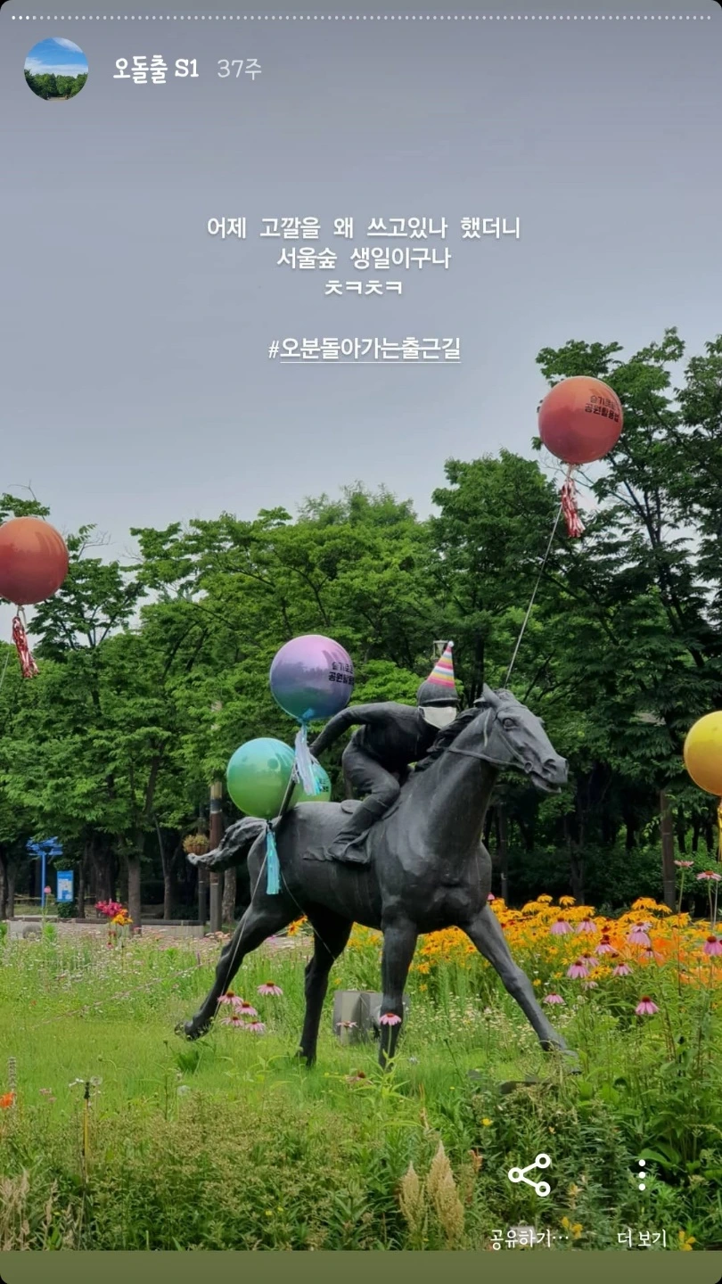 그날 이후, 약 10개월 동안 일주일에 두세 번 서울숲으로 살짝 돌아 출근을 하고 있다. 이름하야 ‘오돌출’. ‘오분 돌아가는 출근길’의 줄임말로, 지금으로부터 약 37주 전 별 의미 없이 붙인 이름이다. 때때로 10분이나 20분을 돌아갈 때도 있었지만, 십돌출이나 이돌출보다 오돌출이 입에 착 감기지 않는가.