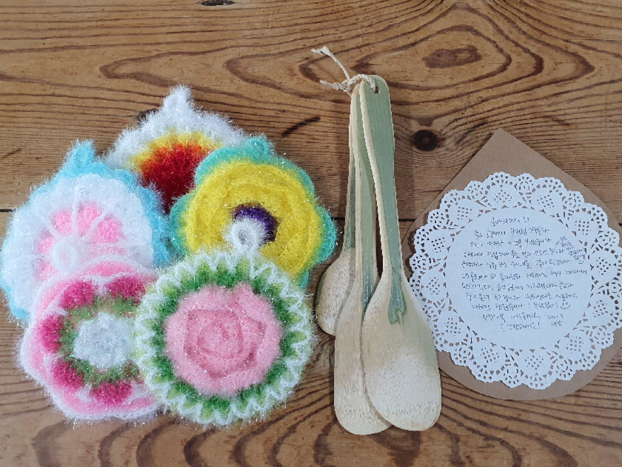 다음 날, 퇴실을 앞두고 엄마는 평소에 즐겨 뜨시는 수세미를 다섯 개 가져오셨고, 아빠는 직접 대나무로 만드신 주걱 세 개를 꺼내셨다. 우리 부모님은 마음을 움직인 공간에는 꼭 무언가를 선물하는데, 여기서도 마찬가지로 많은 것을 받았고, 진심을 남기고 싶으셨던 거다.