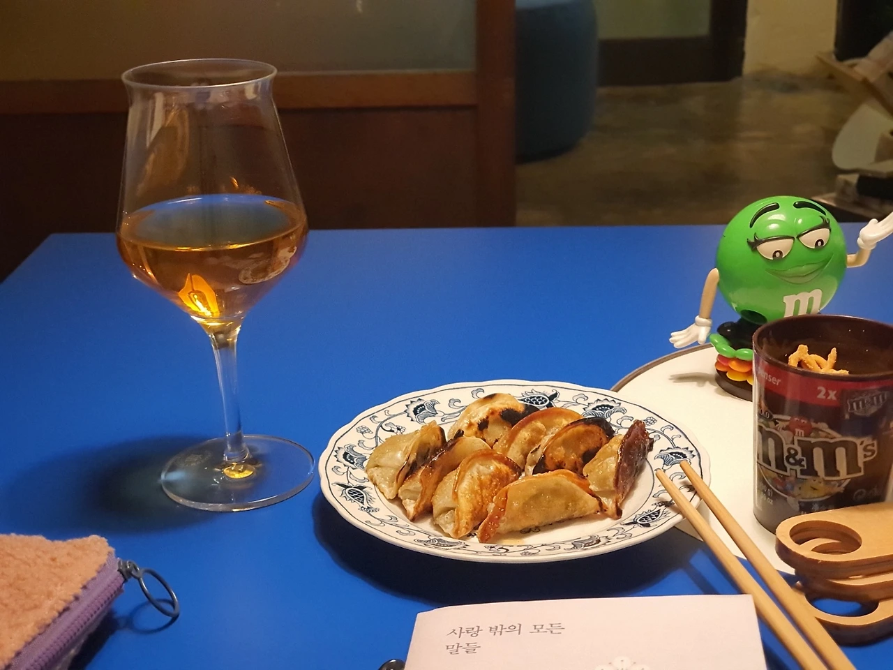 근래 느낀 가장 사치스러운 순간이 언제인지 떠올려보았는데, 경주의 바로 그 보틀샵에서 사랑하는 사우어 맥주를 한 병 사다가, 옆 공간으로 건너가서, 사장님이 구워주신 군만두를 소중히 받아 들고, 만두 한 점, 맥주 한 모금, 책 한 페이지를 보았던 그 장면이 압도적 1위를 차지했다.