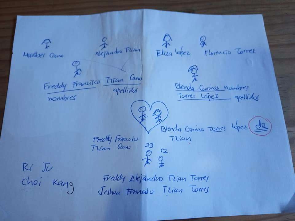 #1. '성과 이름'이라는 주제로 내가 한국은 부계의 성을 따른다고 했더니 과테도 마찬가지라며 가계도를 그려주었다. 부모의 성을 함께 받아 이름이 길다고 했는데 알고 보니 엄마의 성도 결국은 아버지의 성을 물려받는 것이니 양쪽의 부계만 남는 셈이다.