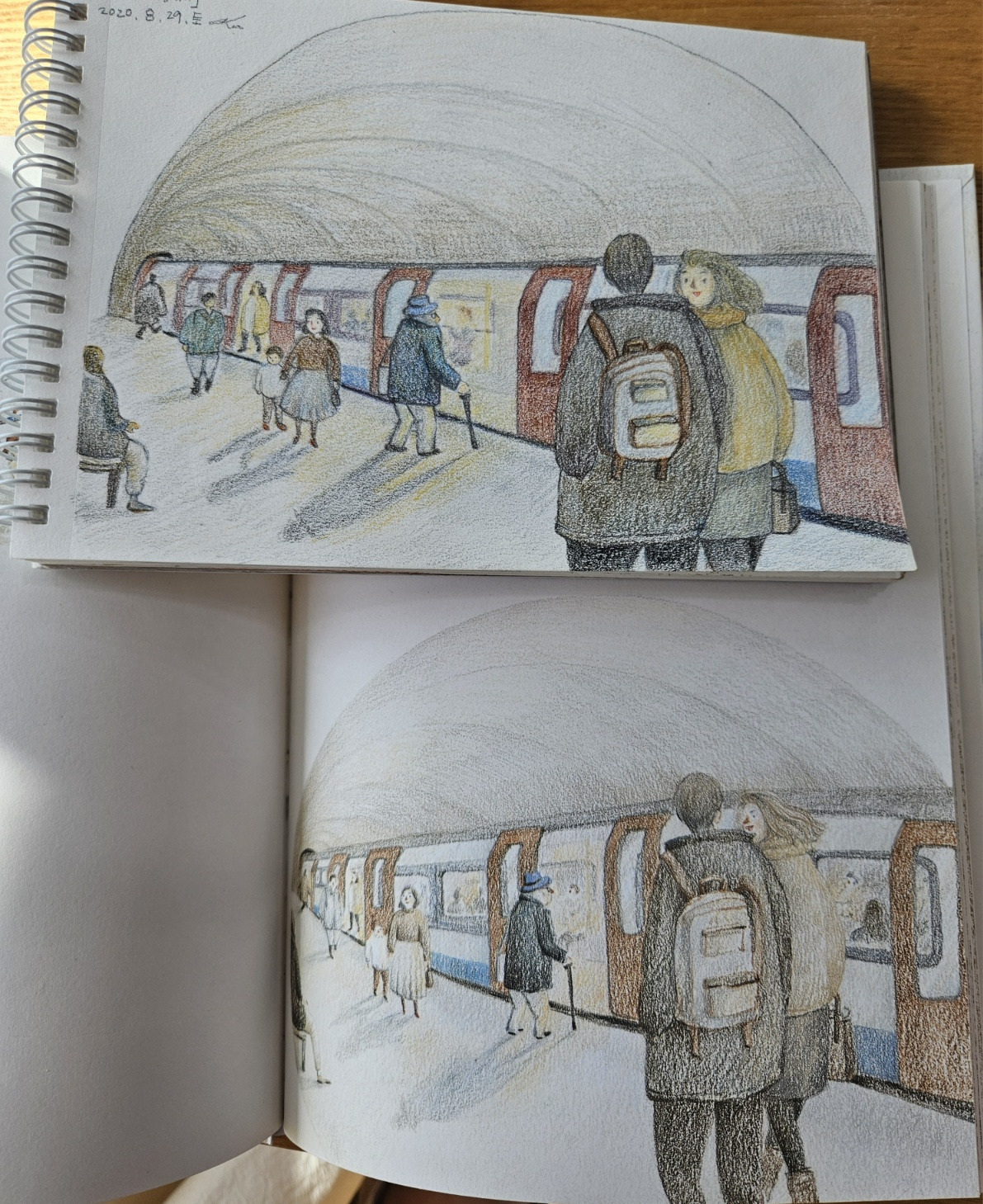 일단 고개를 떨구는 데 성공했다. 됐어 나이스. 자연스러웠어. 떨군 곳에 마침(?) 그의 어깨가 있었고 한두 시간? 두어 시간? 그 자세 그대로 목적지까지 갔다. 그도 눈을 감았던 걸로 안다. 그는 잠이 들었었을까 그리고 알았을까, 내가 안 자는 걸. 아니 나뿐 아닐 거야. 새벽인지 밤인지 칠흑 같던 창밖과 눈부셨던 전등 불빛, 어쩐지 후끈했던 실내공기와 열차 소음만 들리던 기차 안. 그중 누구도 잠든 사람 없었으리라.